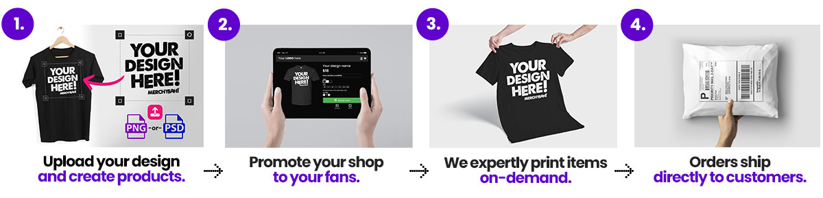 Share with your fans and we handle the rest. Items are custom-printed and delivered directly to customers.