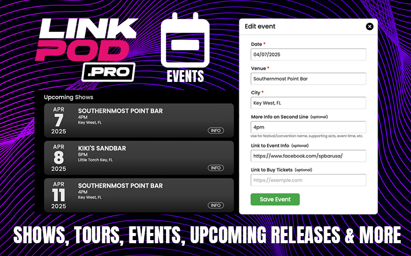 Got shows? Drops? Signings? LinkPod.Pro now includes a clean, built-in calendar. Add events with custom labels, dates, start times, and more. Events automatically clear after they pass—so your page stays fresh.