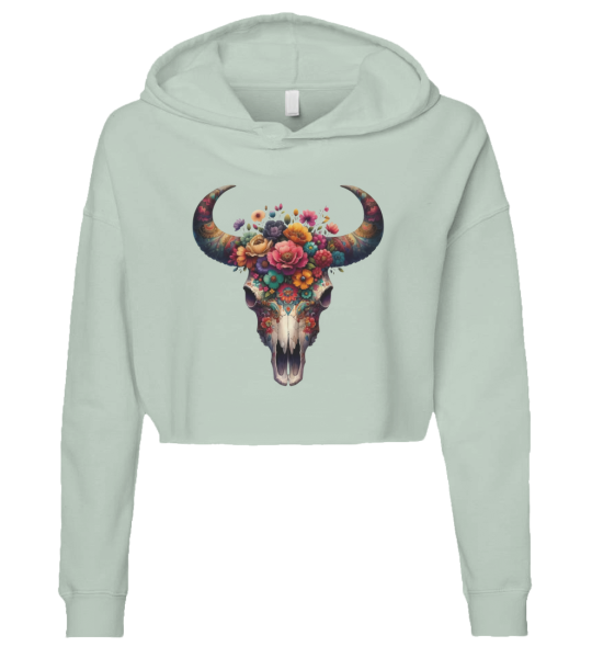 Buffalo Skull with Flowers Cropped Hoodie - Dark & Boho Chic Hoodie