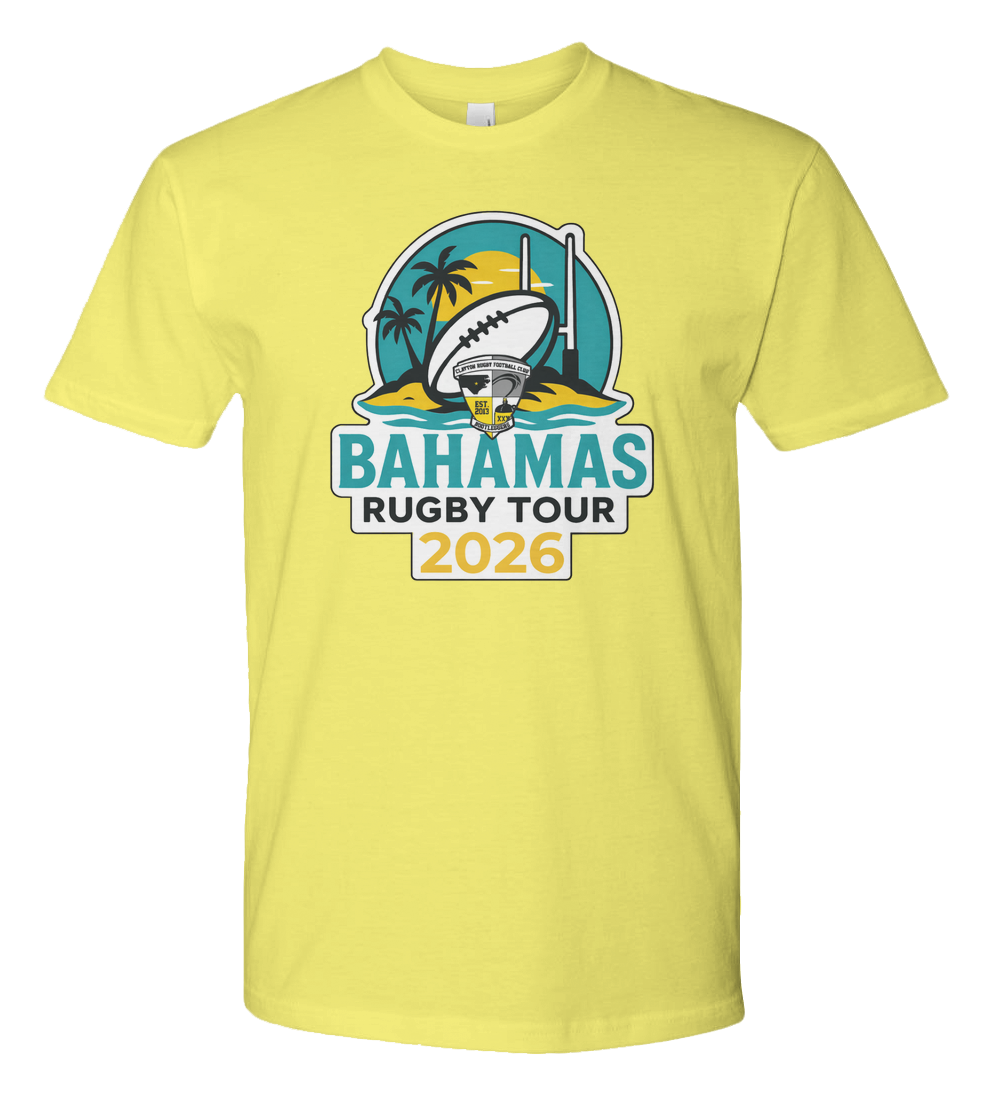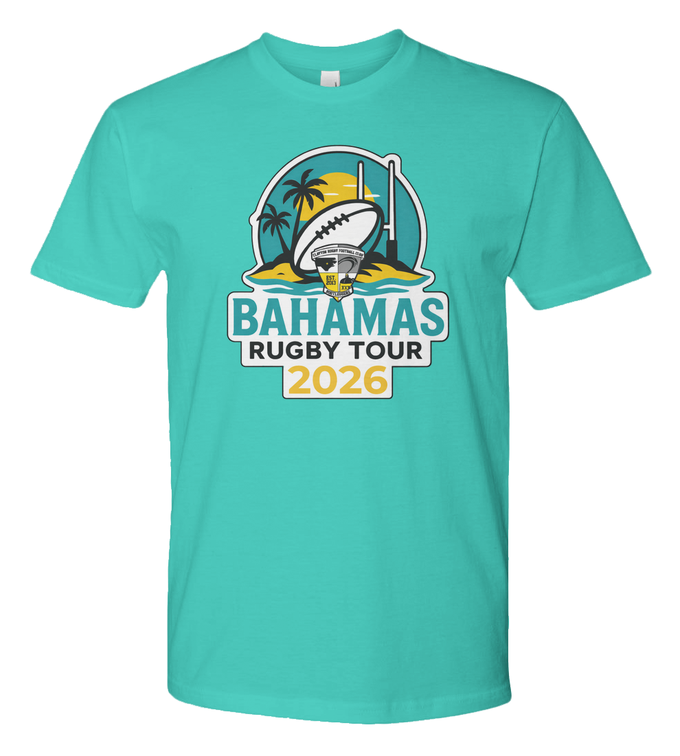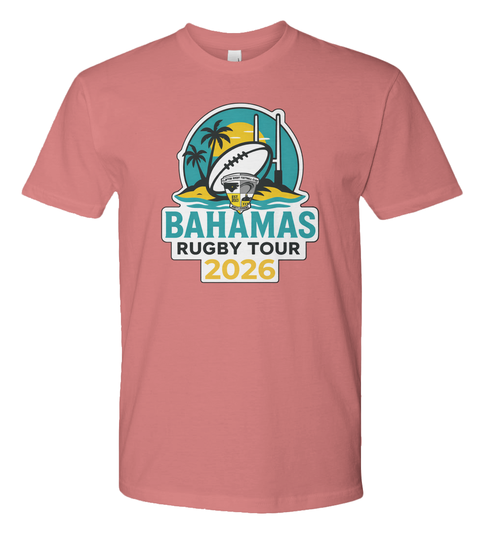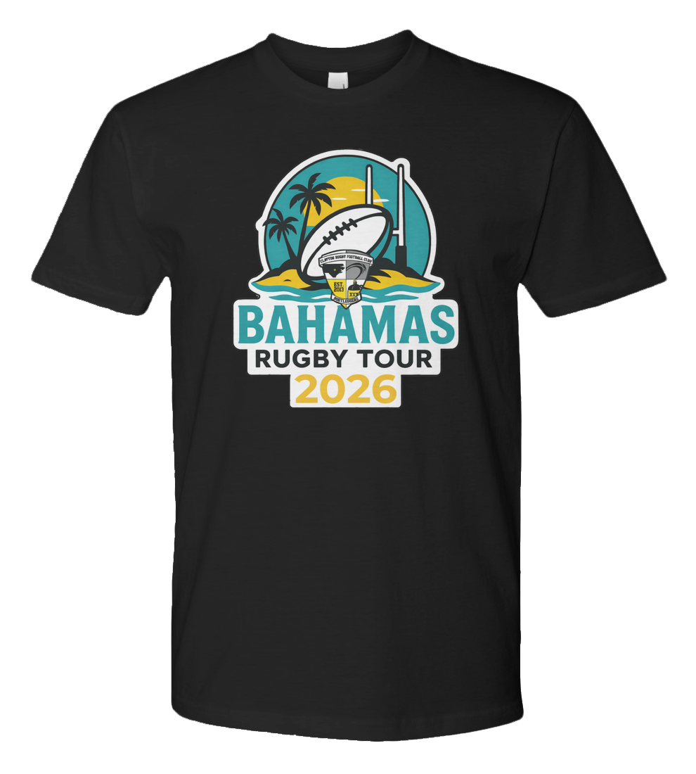 Celebrate rugby, travel, and club pride with the Bahamas Rugby Tour 2026 premium jersey tee. Featuring a bold, full-color tour crest, this design blends tropical island vibes with grassroots rugby tradition. The logo showcases a striking beach sunset, palm trees, and goalposts framing a rugby ball emblazoned with the Clayton Rugby Football Club crestfinished with a thick black outline and clean white border so it pops on any shirt color.