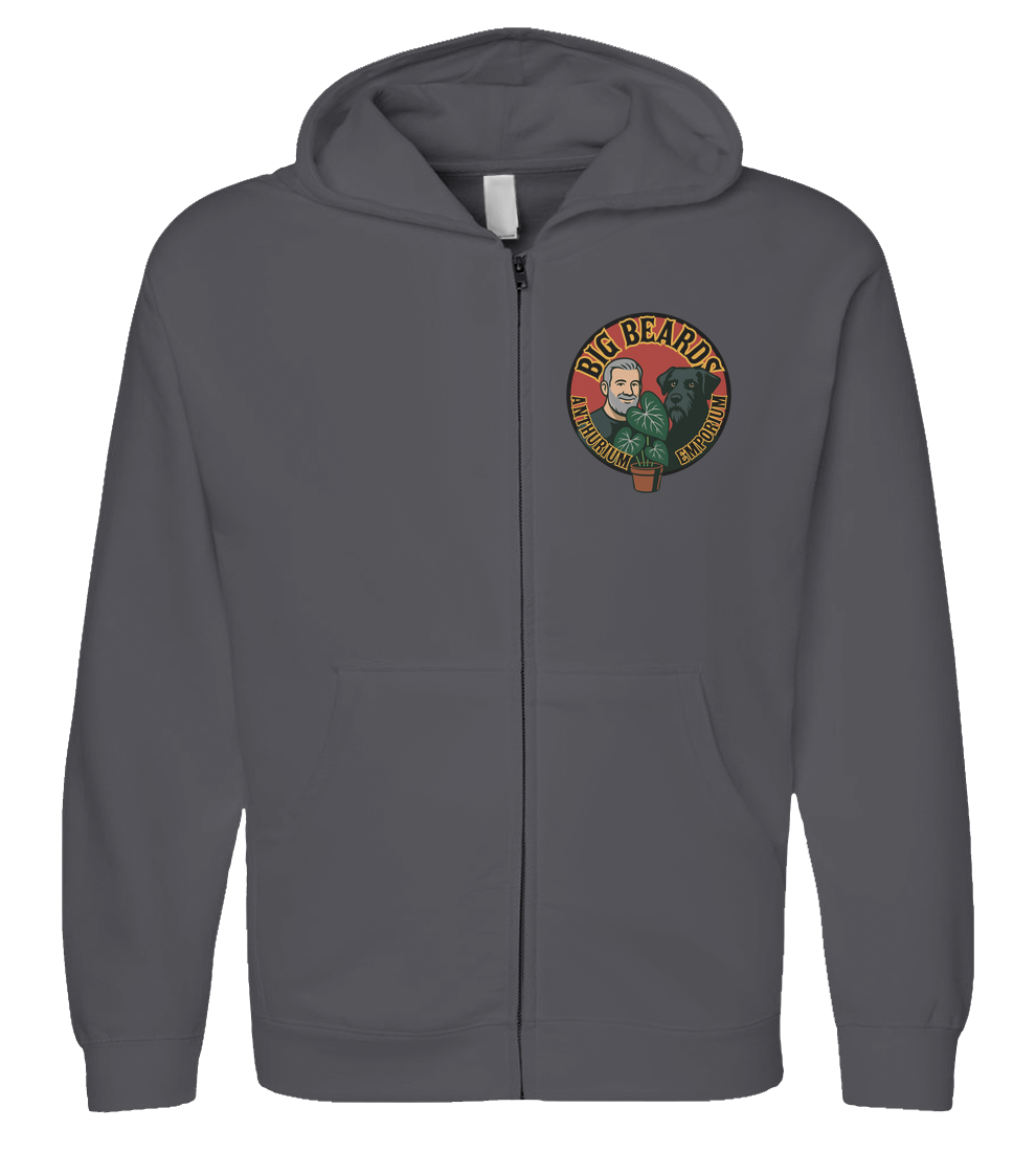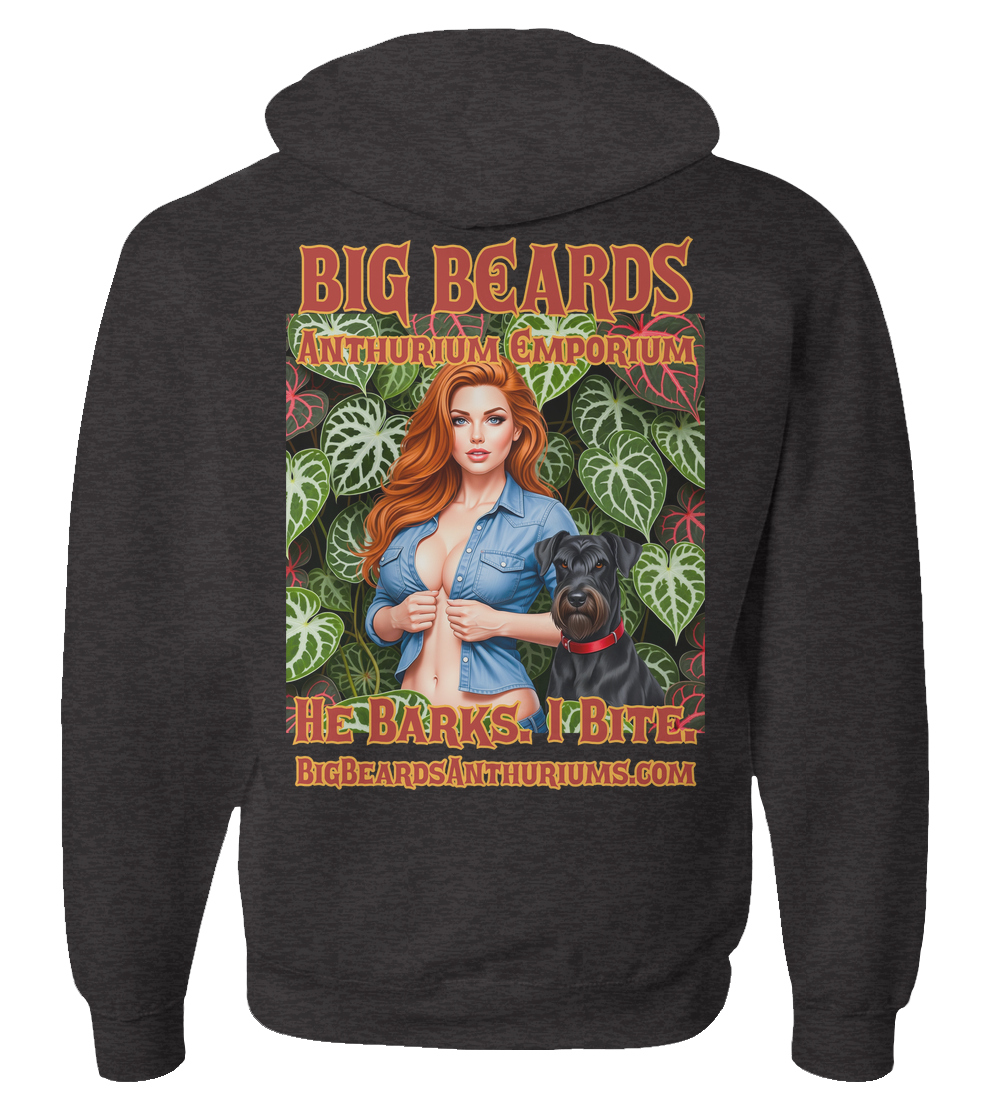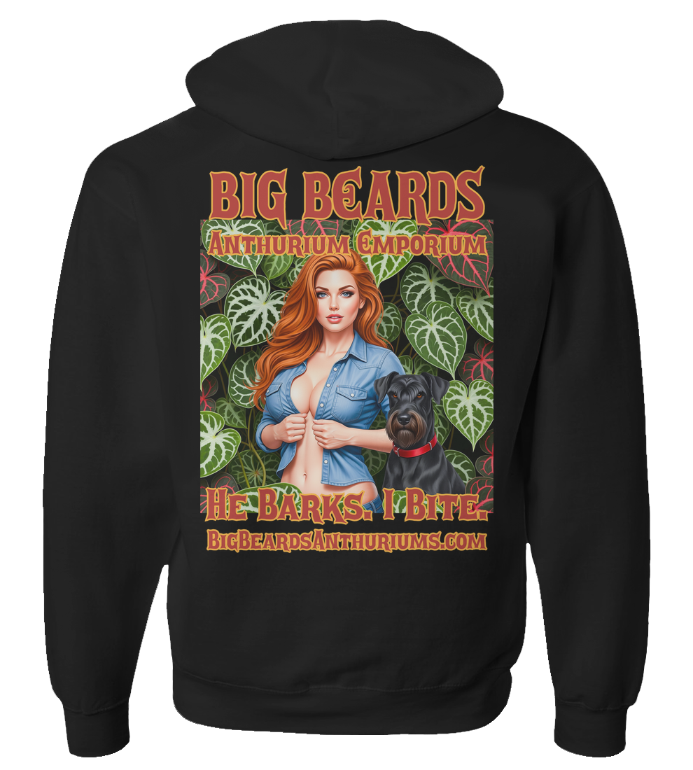 Featuring our full-color He Barks. I Bite. design across the back and the official Big Beards Anthurium Emporium logo on the chest, this hoodie makes a loud statement in the most comfortable way possible.