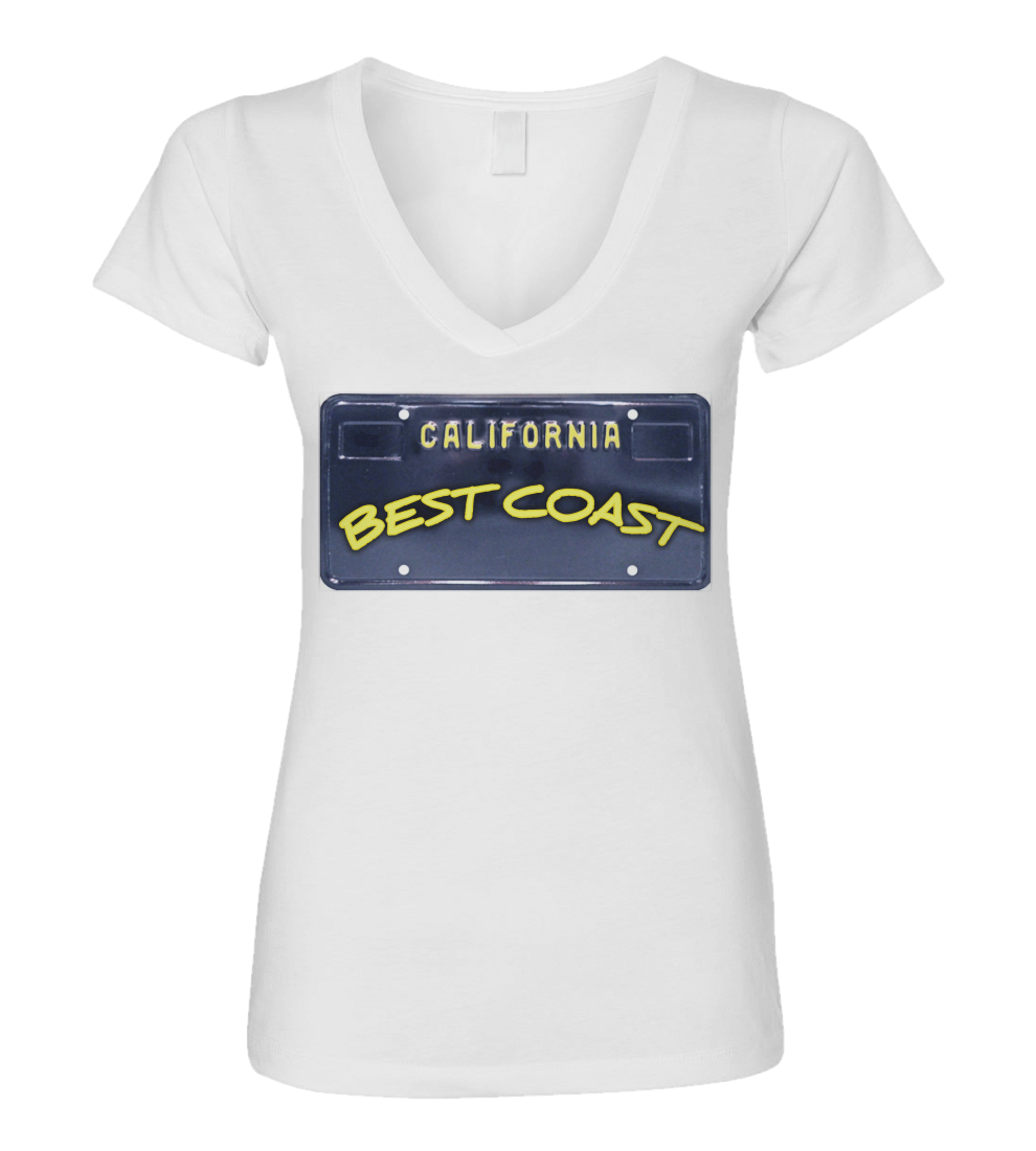 ALL EYES ON YOU BY EVERY LOWRIDER AT THE NEXT CAR SHOW WITH THIS CALIFORNIA LICENSE PLATE V NECK TOPTHAT READS "BEST COAST" FOR THE WEST COAST, THE LEFT COAST. REPRESENT YOUR WESTSIDE LOVE TODAY!