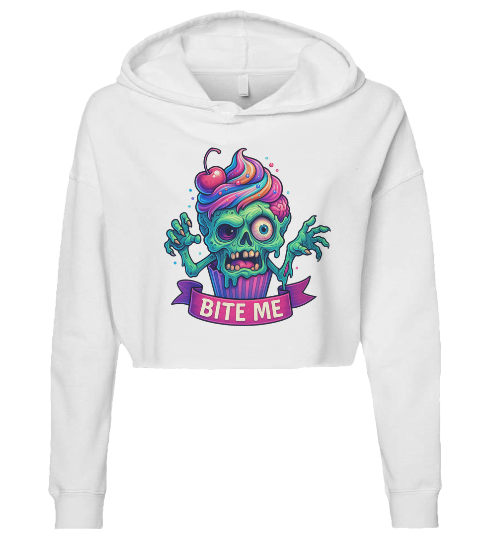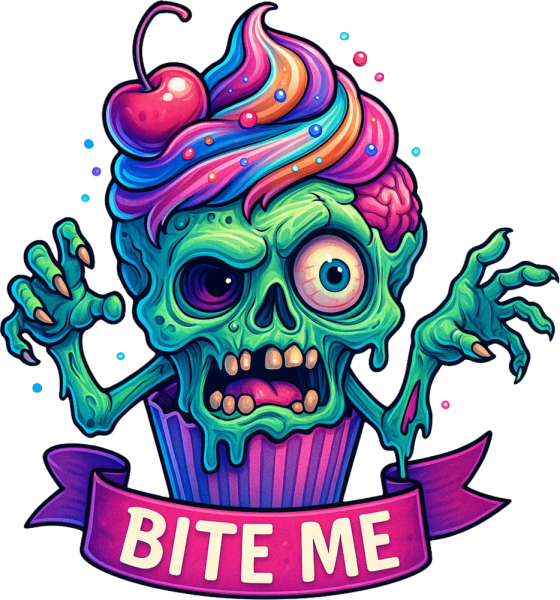 Sweet, sassy, and straight from the grave! This outrageous tee features a zombified cupcake with rainbow frosting, bulging eyeballs, and a not-so-subtle attitude. Perfect for horror lovers with a sweet tooth and zero chill, the Bite Me banner says exactly what youre thinking. Rock it to horror cons, bake sales, or the apocalypse.