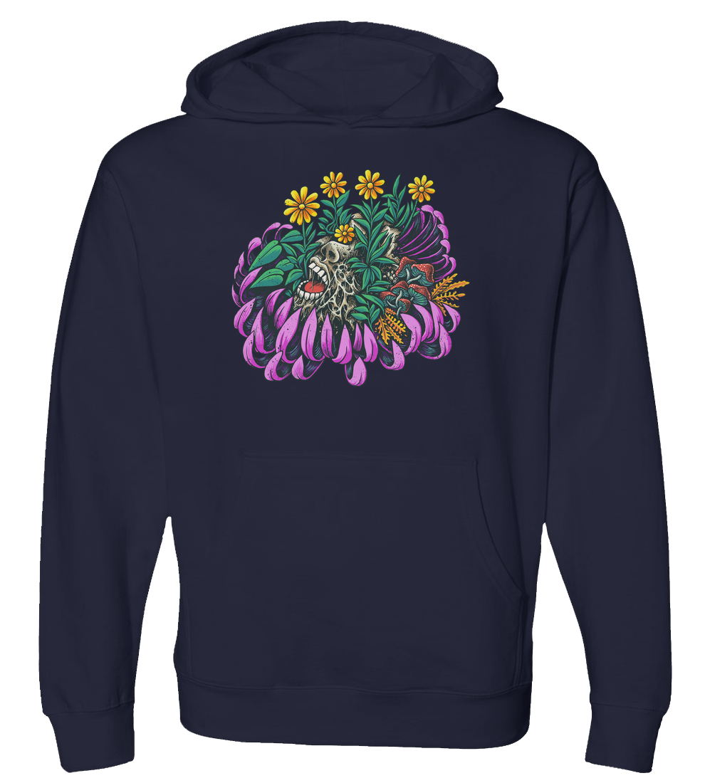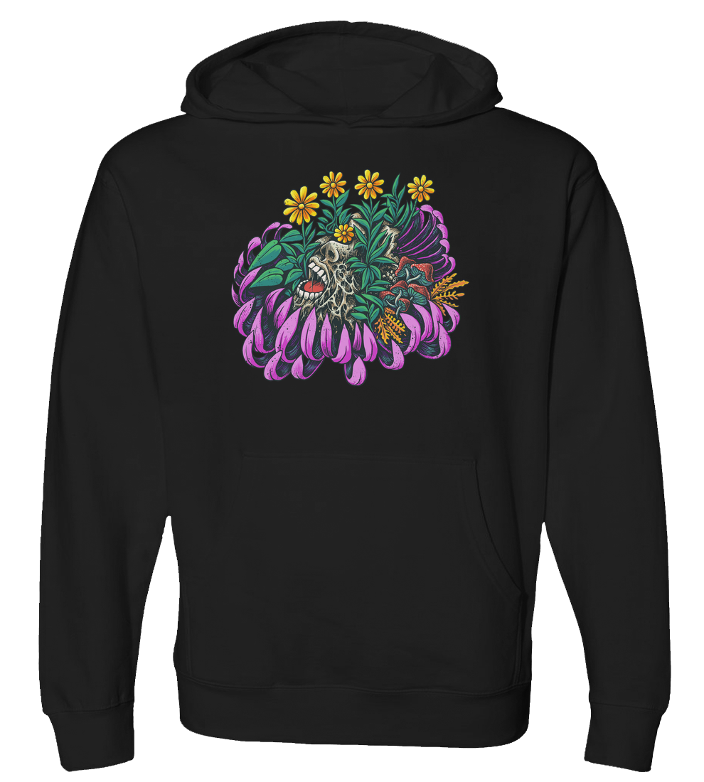 Witness the vibrant intersection of mortality and nature. This design features a weathered skull surrendered to the earth, becoming a vessel for a wild explosion of life. From the sprawling purple petals to the resilient yellow wildflowers and spotted mushrooms, "Eternal Bloom" captures the haunting beauty of the natural cycle. Its a reminder that even in endings, there is a brilliant, colorful new beginning.