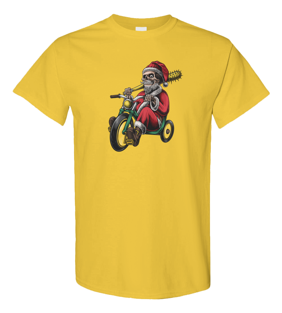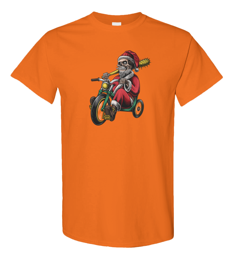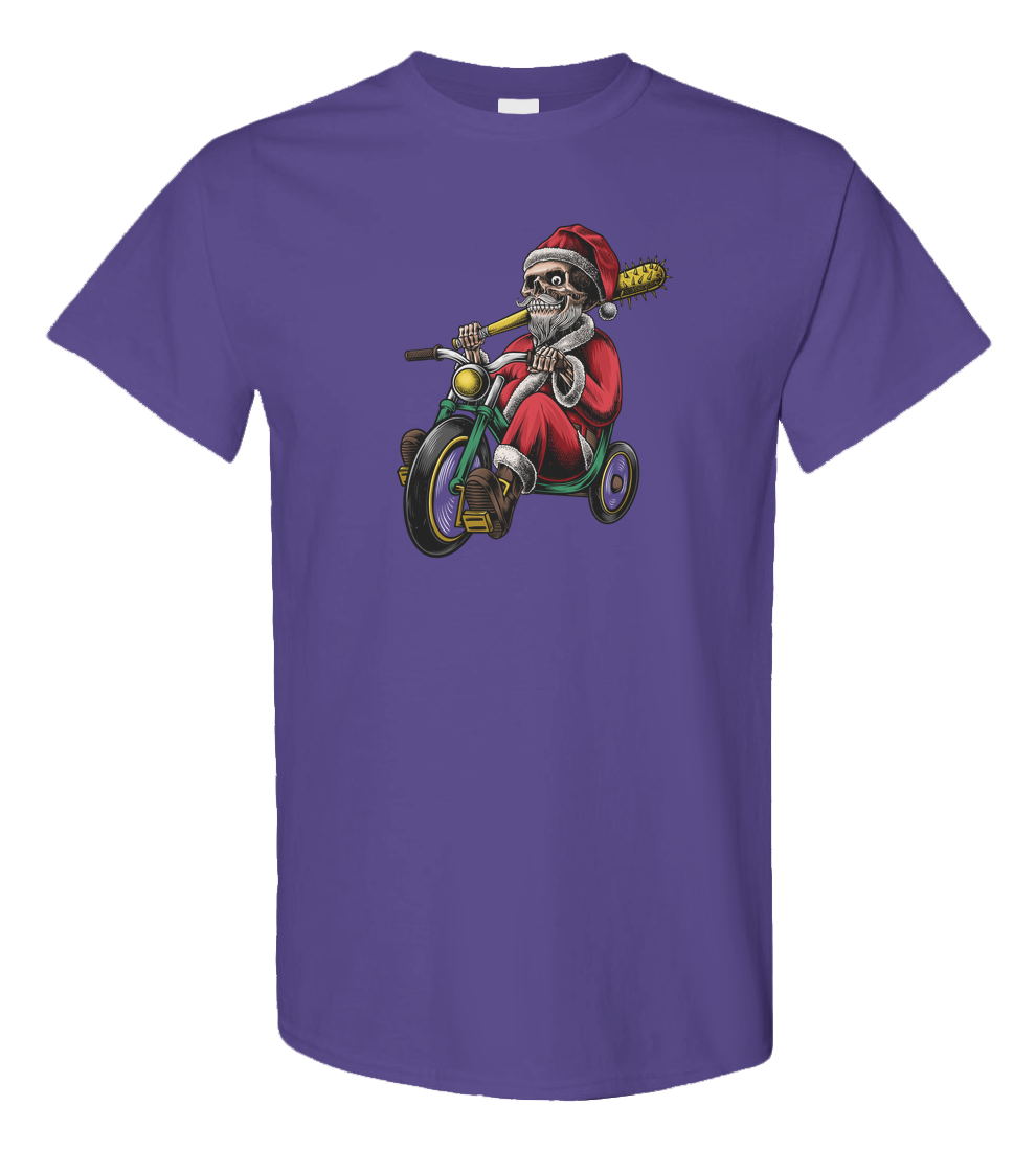 Born to be wild, forced to ride a tricycle. This badass skeleton Santa is coming to town to settle the score on the naughty list. A perfect design for those who like their Christmas with a little bit of grit and humor.