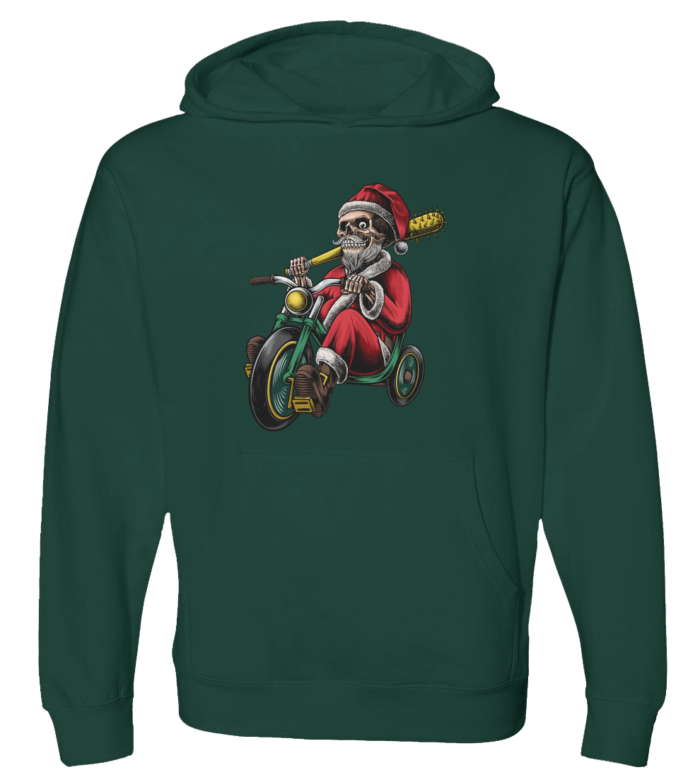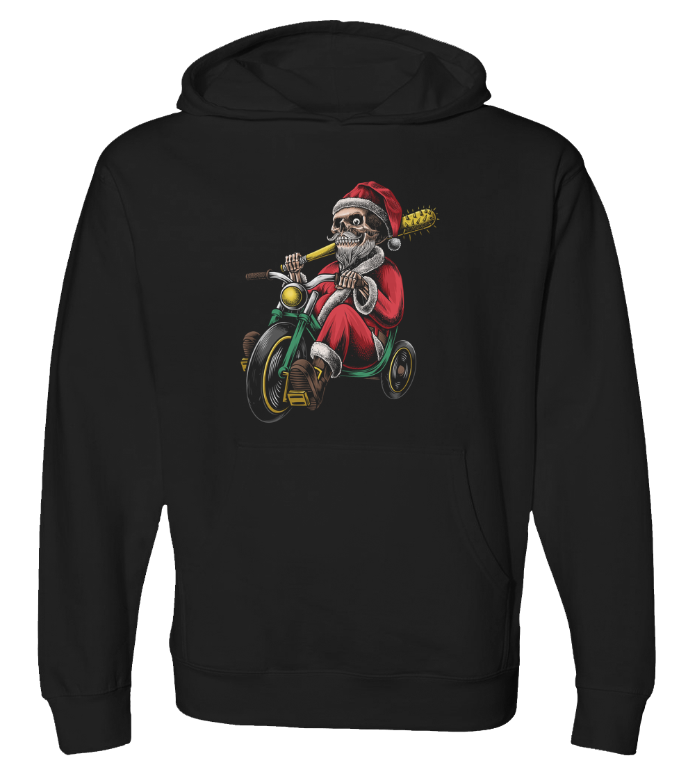 Born to be wild, forced to ride a tricycle. This badass skeleton Santa is coming to town to settle the score on the naughty list. A perfect design for those who like their Christmas with a little bit of grit and humor.