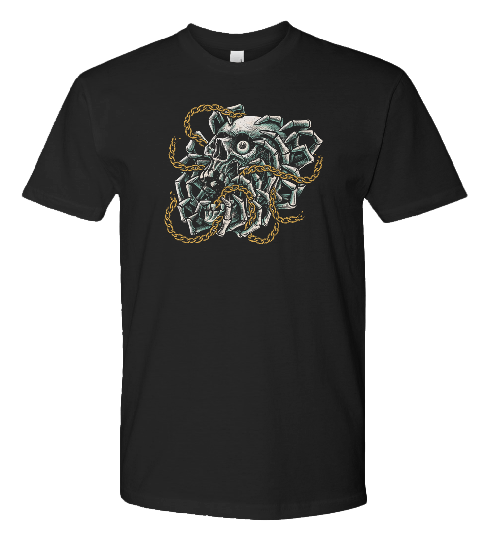 A hauntingly detailed illustration featuring a skull gripped by a multitude of skeletal hands, entwined in broken golden chains. This piece explores themes of internal struggle, the breaking of cycles, and the intense gaze of a spirit that refuses to be silenced. With its intricate cross-hatching and bold teal-and-gold palette, its a perfect statement piece for fans of dark surrealism and edgy streetwear
