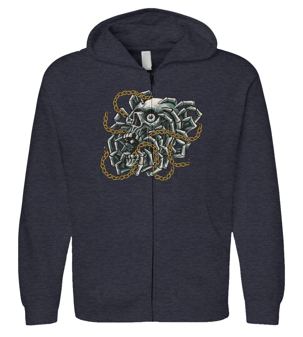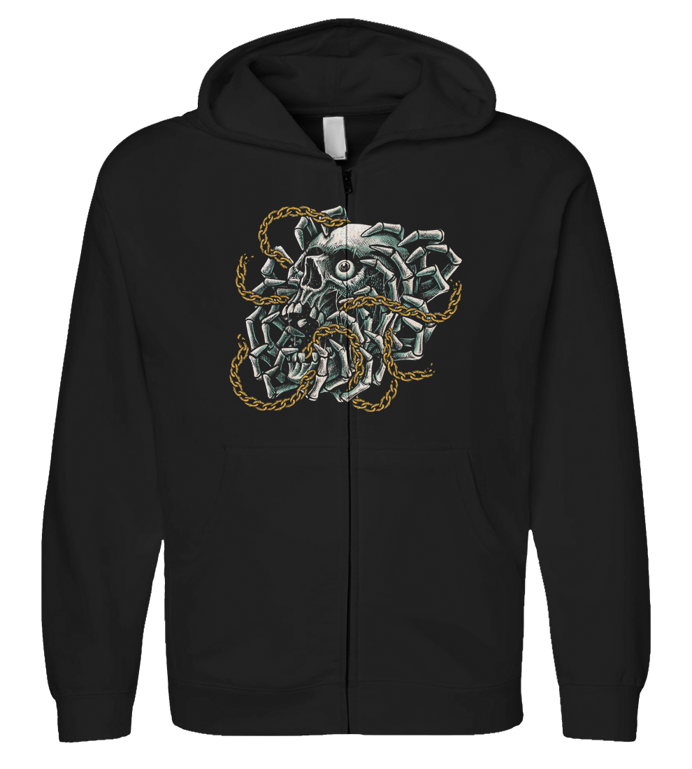 A hauntingly detailed illustration featuring a skull gripped by a multitude of skeletal hands, entwined in broken golden chains. This piece explores themes of internal struggle, the breaking of cycles, and the intense gaze of a spirit that refuses to be silenced. With its intricate cross-hatching and bold teal-and-gold palette, its a perfect statement piece for fans of dark surrealism and edgy streetwear