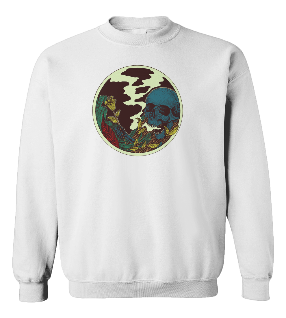 Skull in the bushes with flowers in hand