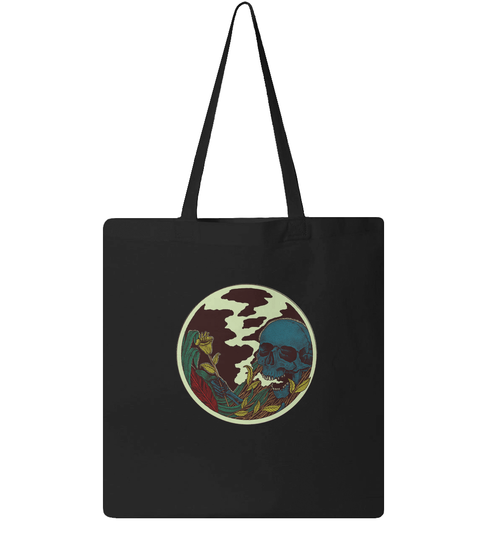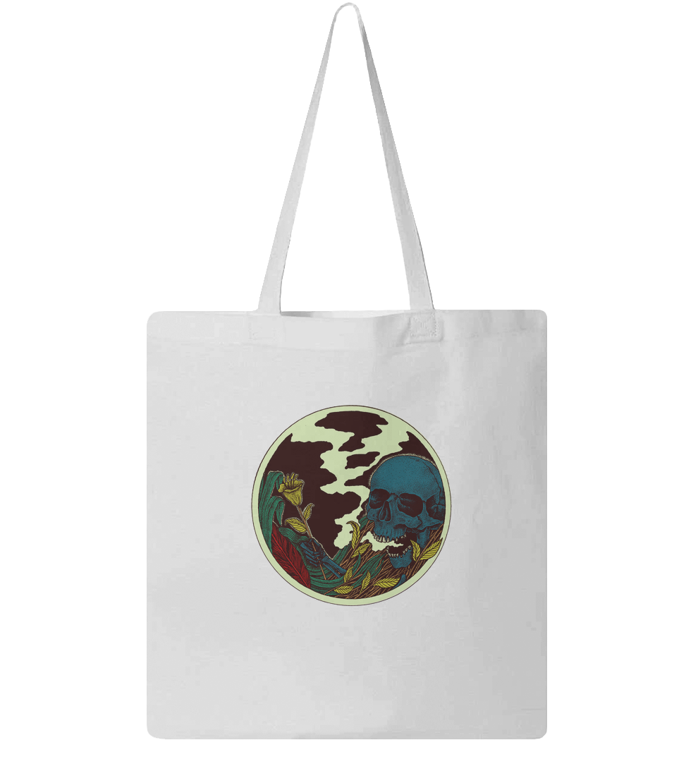 Skull in the bushes with flowers in hand