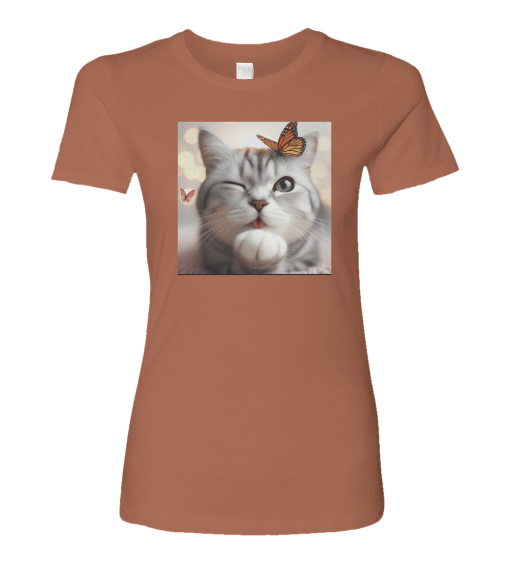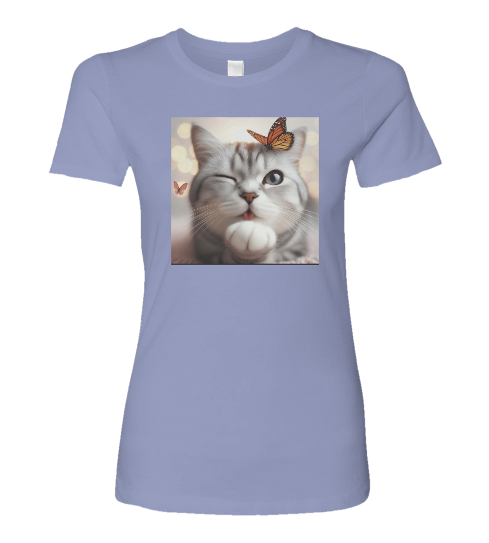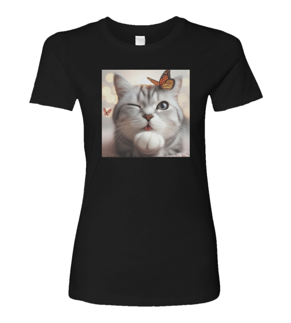 Show your love for felines and spread positivity with this adorable women's t-shirt featuring a cute cat winking its eye and declaring, "I love you.The playful design is accentuated by a delicate butterfly perched on top of the cat's head, adding a touch of whimsy to this charming shirt.Made from high-quality materials, this t-shirt is not only stylish but also comfortable to wear, making it the perfect addition to your casual wardrobe.
