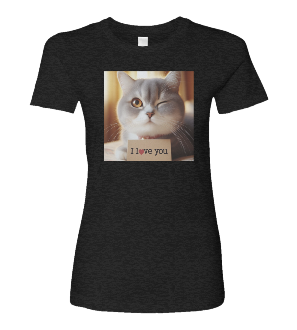 Introducing our adorable and charming women's T-shirt featuring a delightful image of a cat with a sign that says, "I love you." This eye-catching design showcases a playful cat winking its eye, adding a touch of whimsy and affection to your outfit. Crafted with the utmost care, this T-shirt combines comfort and style, making it a perfect choice for cat lovers who want to express their love in a fashionable way. Embrace the cuteness and spread love with our cat-themed T-shirt.