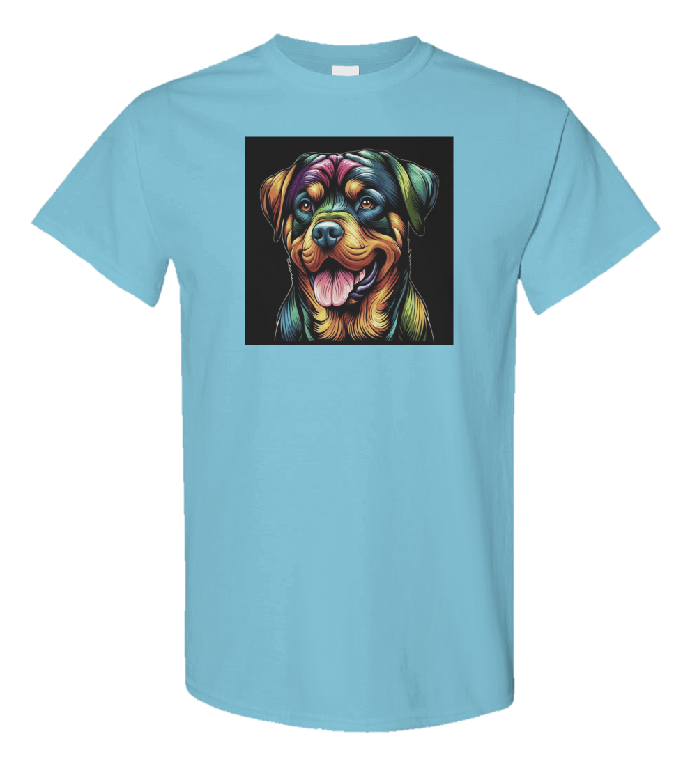 This vibrant and eye-catching dog t-shirt is a must-have for all dog lovers out there! Featuring the face of a majestic Rockweller dog, this colorful t-shirt is sure to make a statement wherever you go. The intricate details of the dog's face are beautifully captured, showcasing the breed's strong and confident expression.