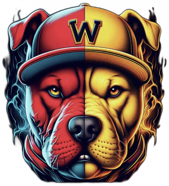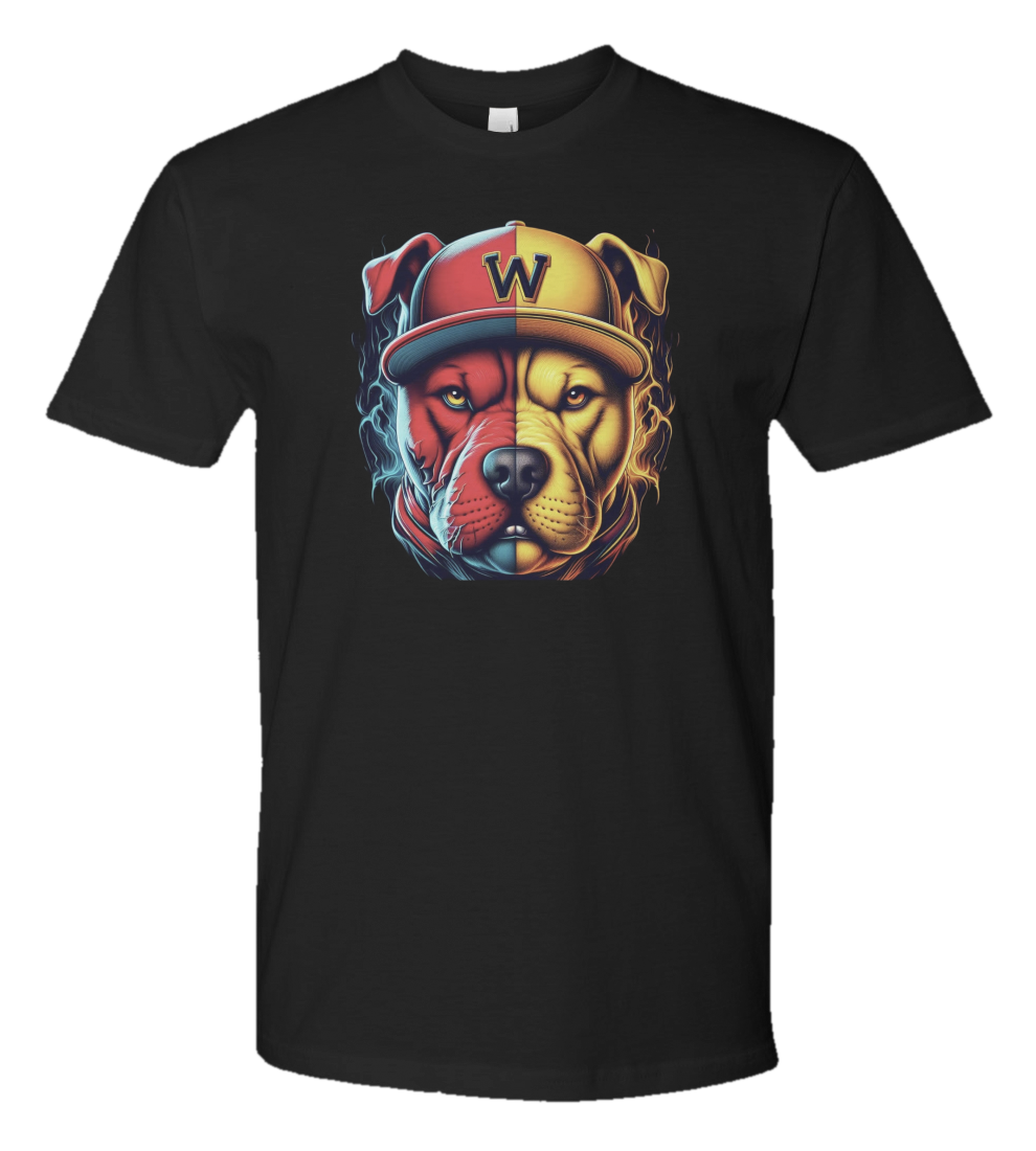 Celebrate your passion for dogs and stand out in style with this exclusive t-shirt! Whether you're treating yourself or surprising a fellow dog lover, this shirt is a definite must-have for anyone wanting to inject some fun and flair into their wardrobe. Don't let this chance slip away to own this charming and trendy piece—grab your very own colorful red and yellow face PIT BULL DOG with a W CAP on his head t-shirt today!