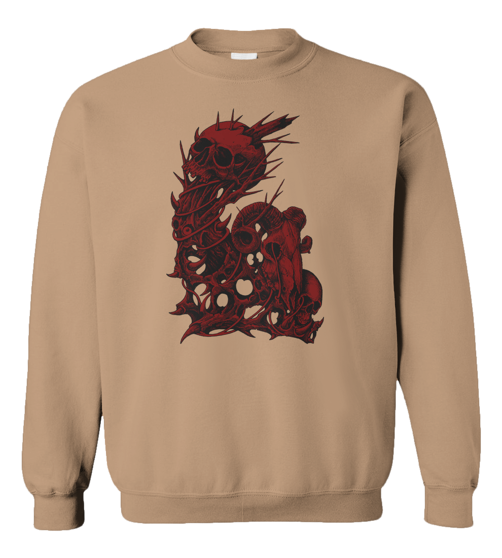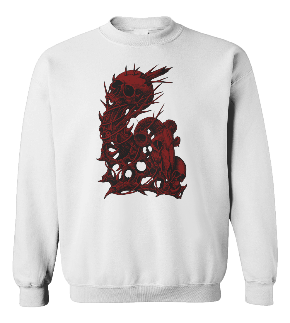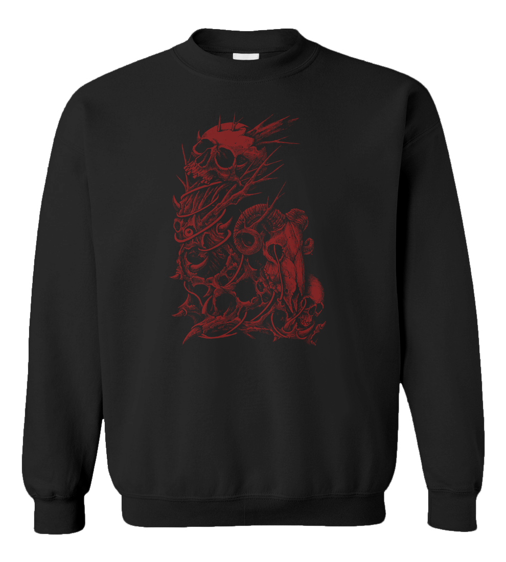 A highly detailed, visceral piece depicting a chalice-like structure formed by human and horned animal skulls (Baphomet/ram) entangled in a thicket of razor-sharp bone spikes and fleshy tendrils. Perfect for a brutal Death or Black Metal album cover emphasizing themes of eternal torment, sacrifice, and the grotesque.