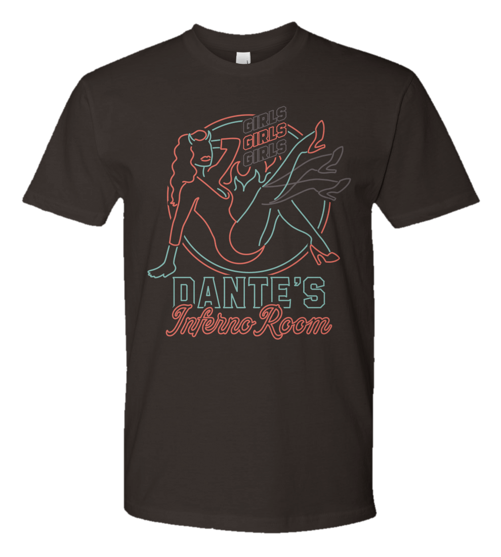 This cool and awesome t-shirt is perfect for those who love TV shows, ghost stories, summoning demons, and classic vintage horror movies. Featuring a pinup neon sign for a gentleman club full of seductive devil women. With the quote "Inferno Room and Girls".