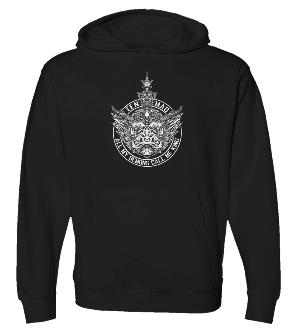 Thai-styled Tosakan head with a mantra of the Tenmao brand in white ink: "All My Demons Call Me King."