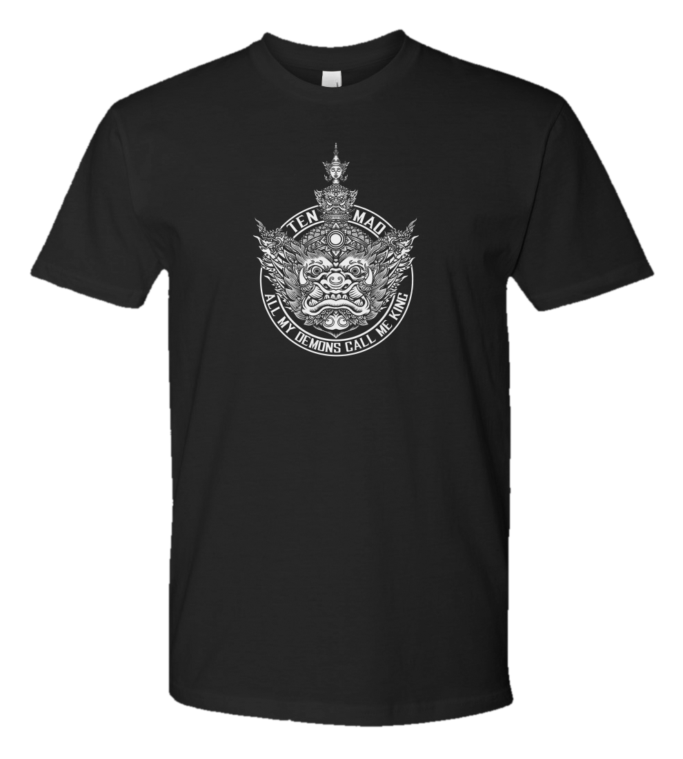 Thai-styled Tosakan head with a mantra of the Tenmao brand in white ink: "All My Demons Call Me King."