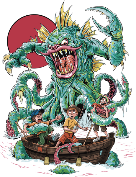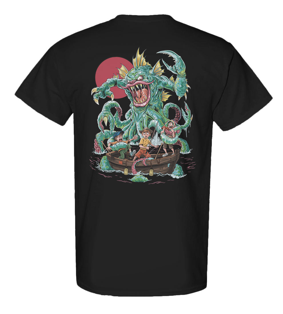 This tee pays tribute to the golden age of aquatic horror, where the film grain was gritty, the screams were salty, and no one ever made it back to shore. Three kids. One tiny boat. One very bad idea. When something monstrous takes the bait, its already too late.