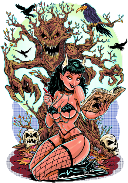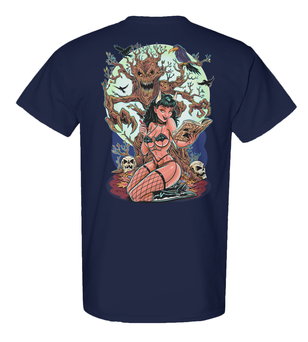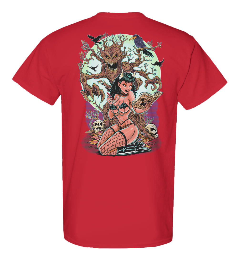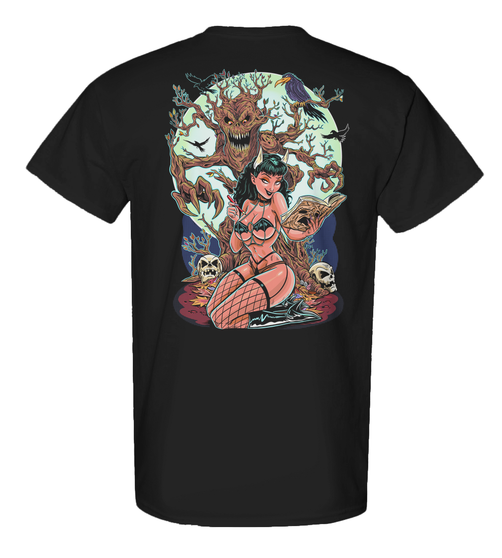 This shirt is a shrine to dangerous beauty, forbidden knowledge, and grindhouse glamour, where pinup curves meet the creeping terror of the unnatural. Every line of art drips with pulp-horror seduction, cinematic menace, and a whisper of the wickedly erotic.