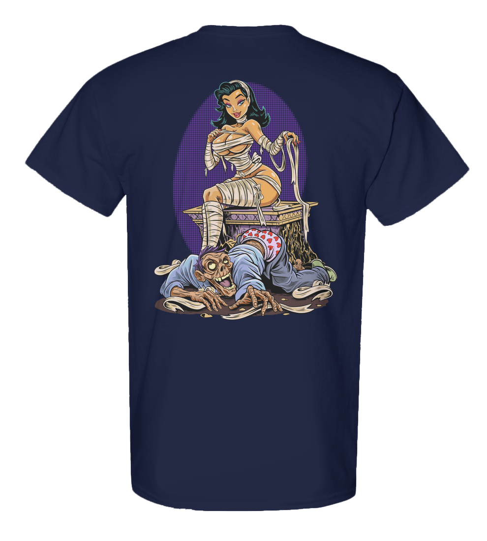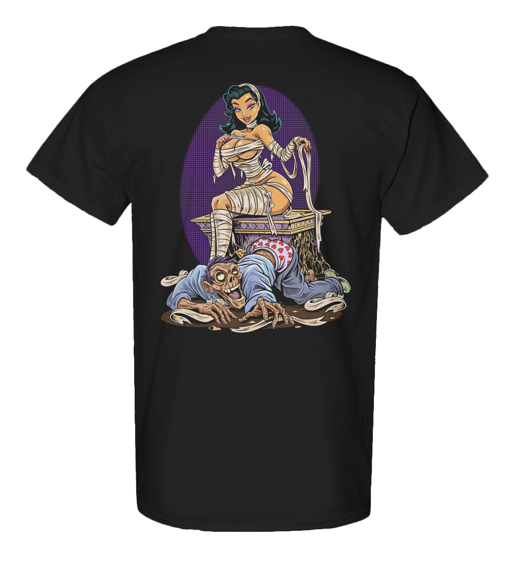 This tee is a shrine to forbidden love and grindhouse glamour, where horror and desire share the same pulse. Inspired by the sleazy magic of 70s and 80s cult cinema, Unwrapped blends pinup curves, undead hunger, and that flickering film-reel danger that made monsters sexy long before Twilight ruined it.