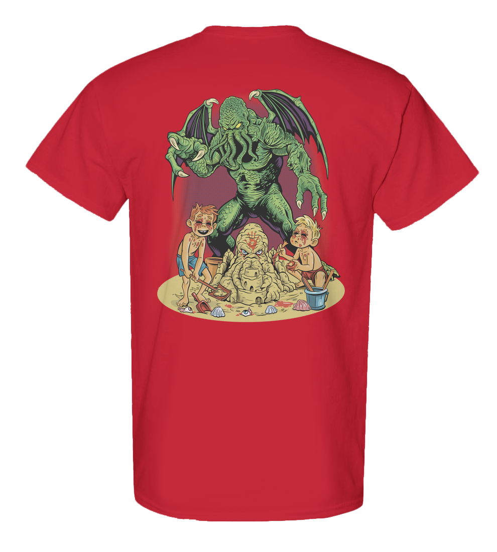 Think The Goonies meets The Necronomicon: campy adventure, cosmic horror, and bad decisions colliding in sunburned, sandy chaos. This shirt bleeds blood, beach days gone wrong, and unapologetic B-movie energy.