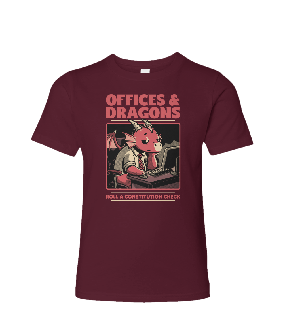 This cool, funny, and awesome t-shirt is perfect for those who love RPG, fantasy, adventure, and mythical creatures, are burned out and hate working. Featuring tired dragon working in the computer with the quote "Office & Dragons - roll a constitution check", in vintage book cover illustration style.