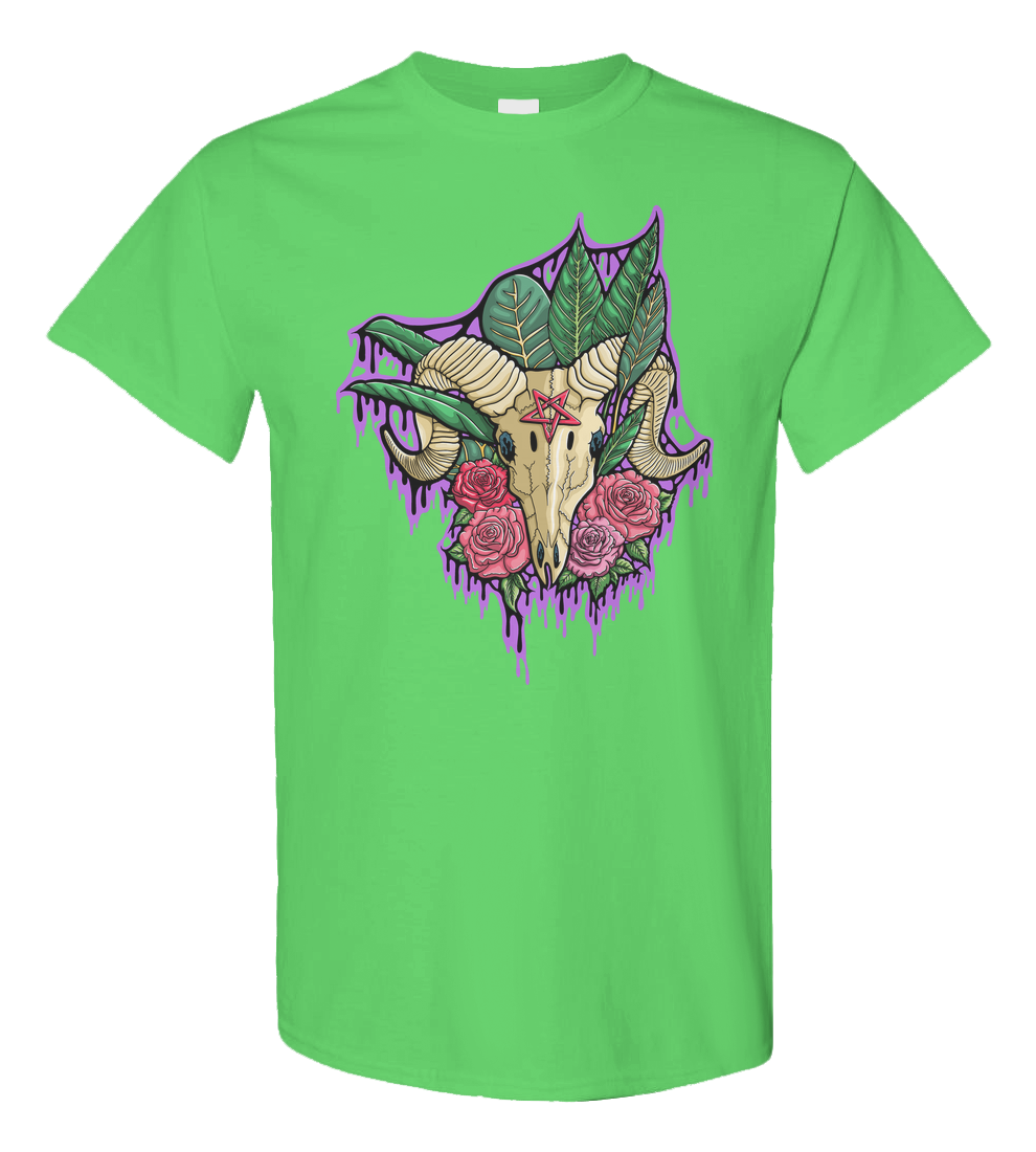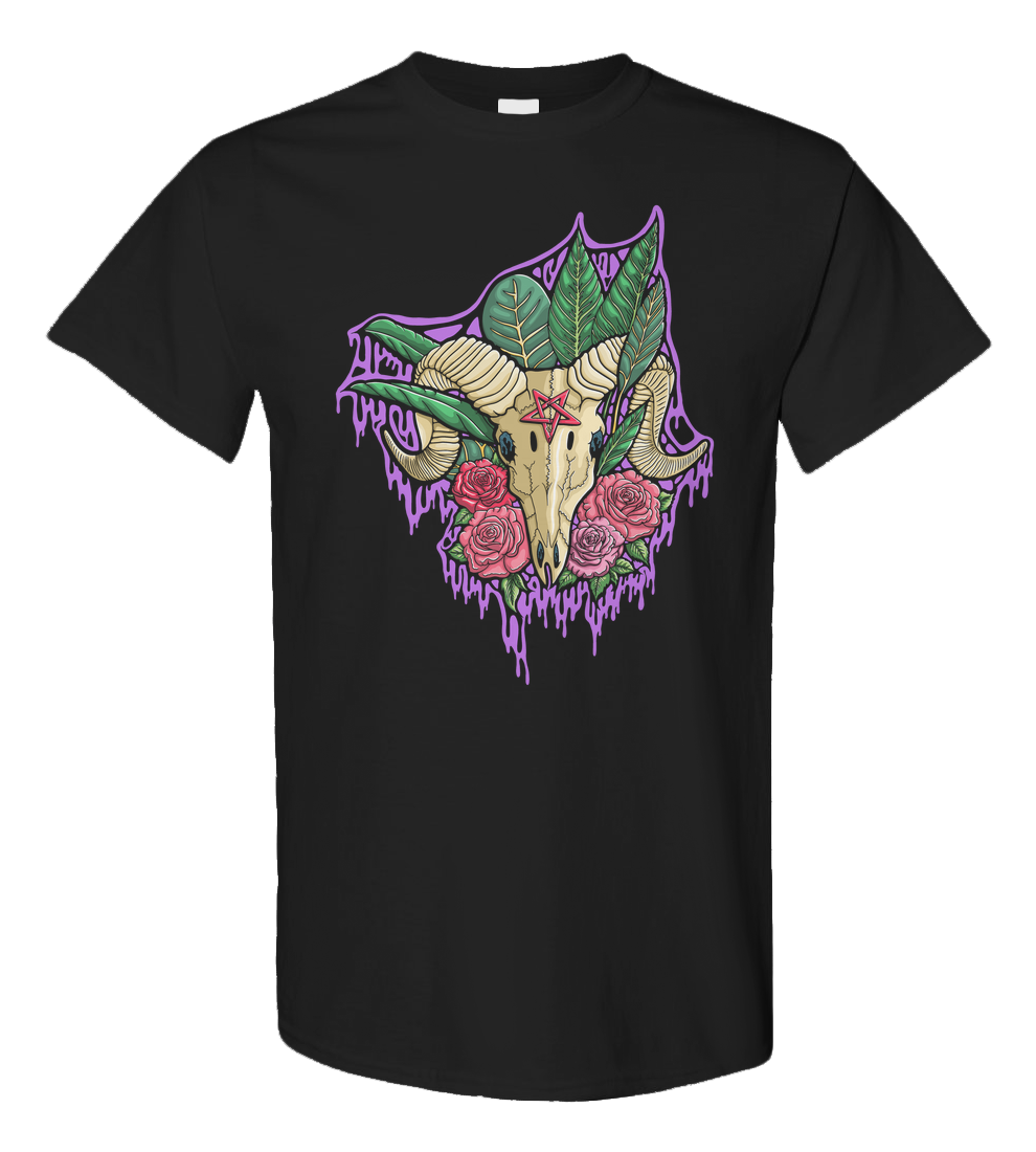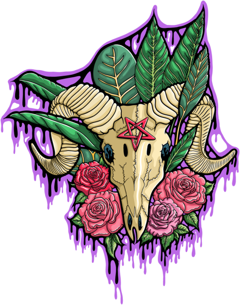 This design was inspired by darker symbolism and my love for mixing natural elements with the macabre. I hand-drew this ram skull with curling horns, roses, and tropical leaves, topped off with a bold red pentagramall dripping in my signature style. Its equal parts mystical, eerie, and vibrant.