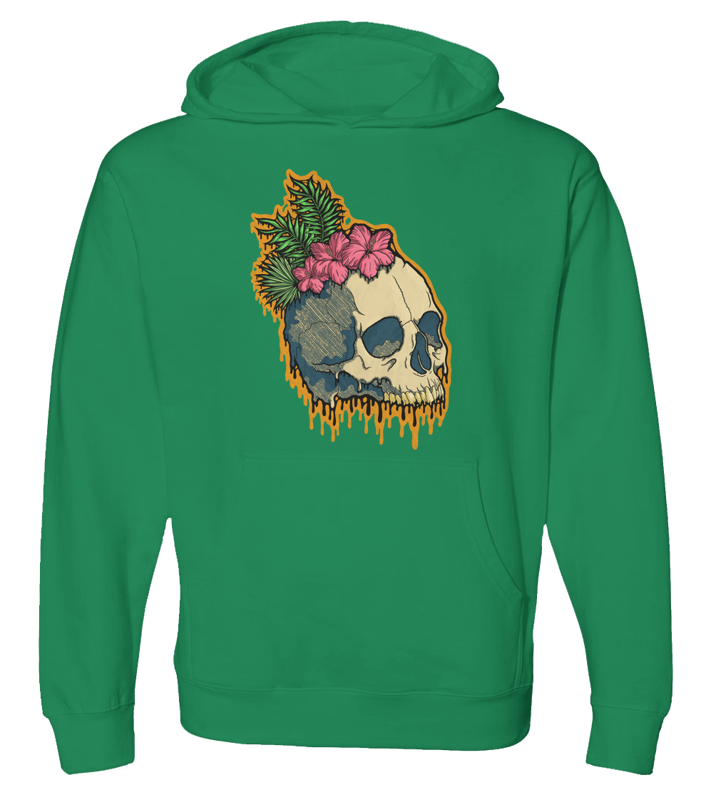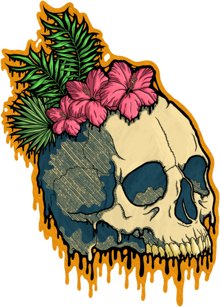 This design was inspired by the contrast between life and decay. I hand-drew this skull with bold hibiscus flowers and lush tropical leaves growing out of it, all dripping in my signature style. The mix of vibrant pinks and greens against bone gives it a look thats both striking and eerie.