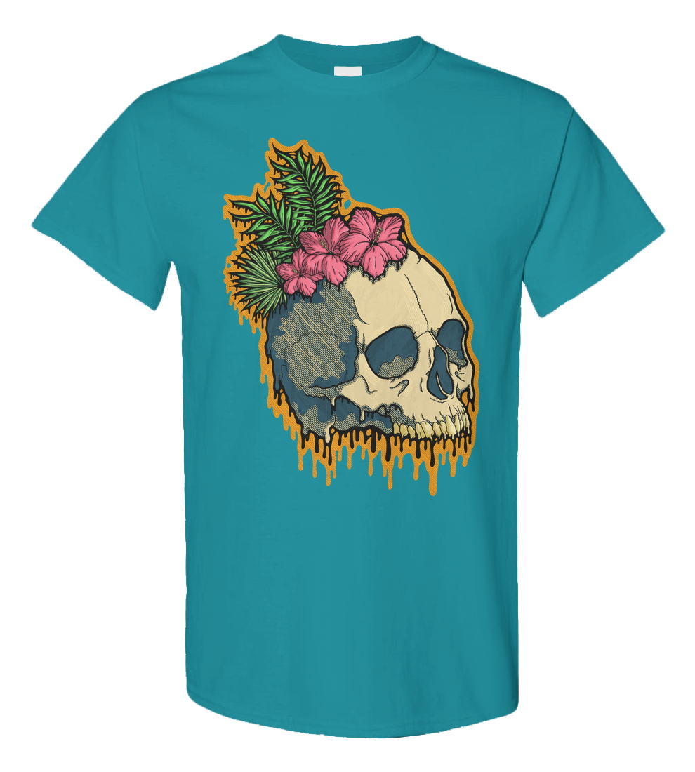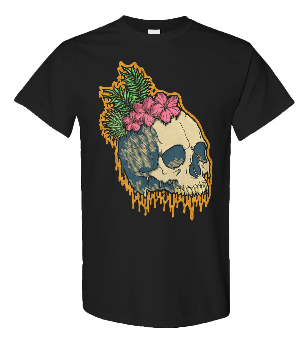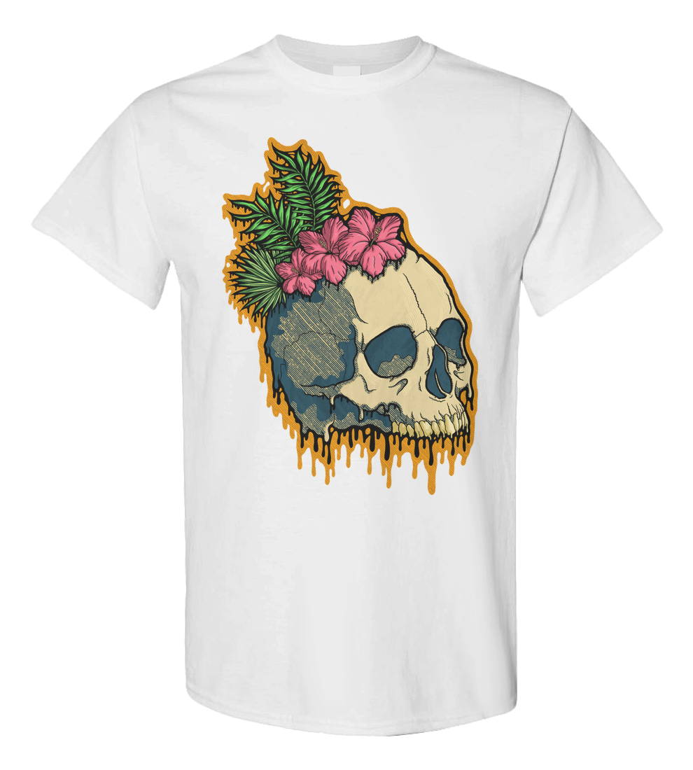 This design was inspired by the contrast between life and decay. I hand-drew this skull with bold hibiscus flowers and lush tropical leaves growing out of it, all dripping in my signature style. The mix of vibrant pinks and greens against bone gives it a look thats both striking and eerie.