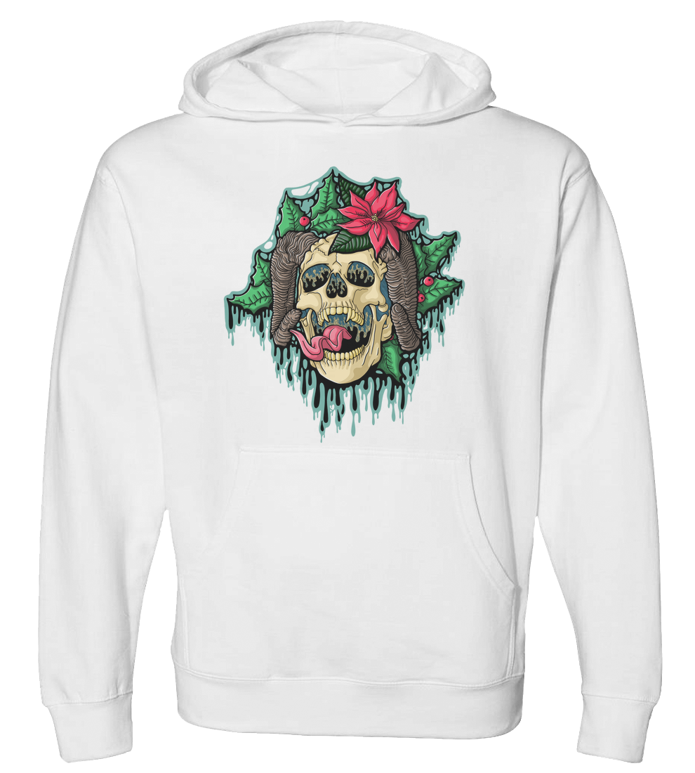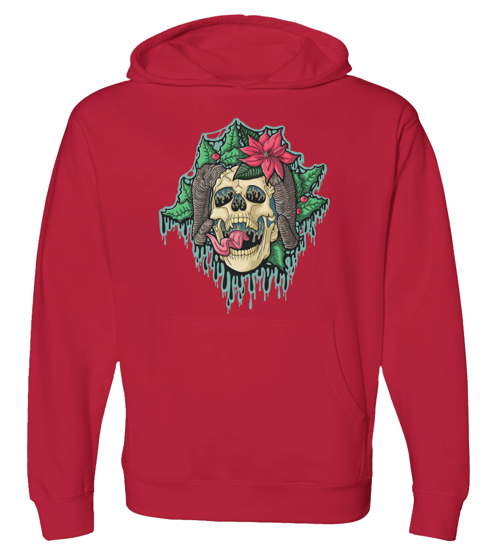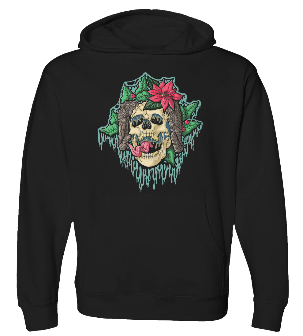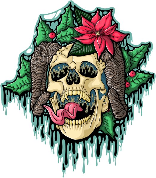 This piece takes holiday folklore and twists it into something dark and eerie. I hand-drew this design with a drippy skull decked out in Krampus horns, surrounded by holly leaves, berries, and a bright poinsettia. Its a mix of festive and sinister, perfect for anyone who loves the creepier side of the holidays.
