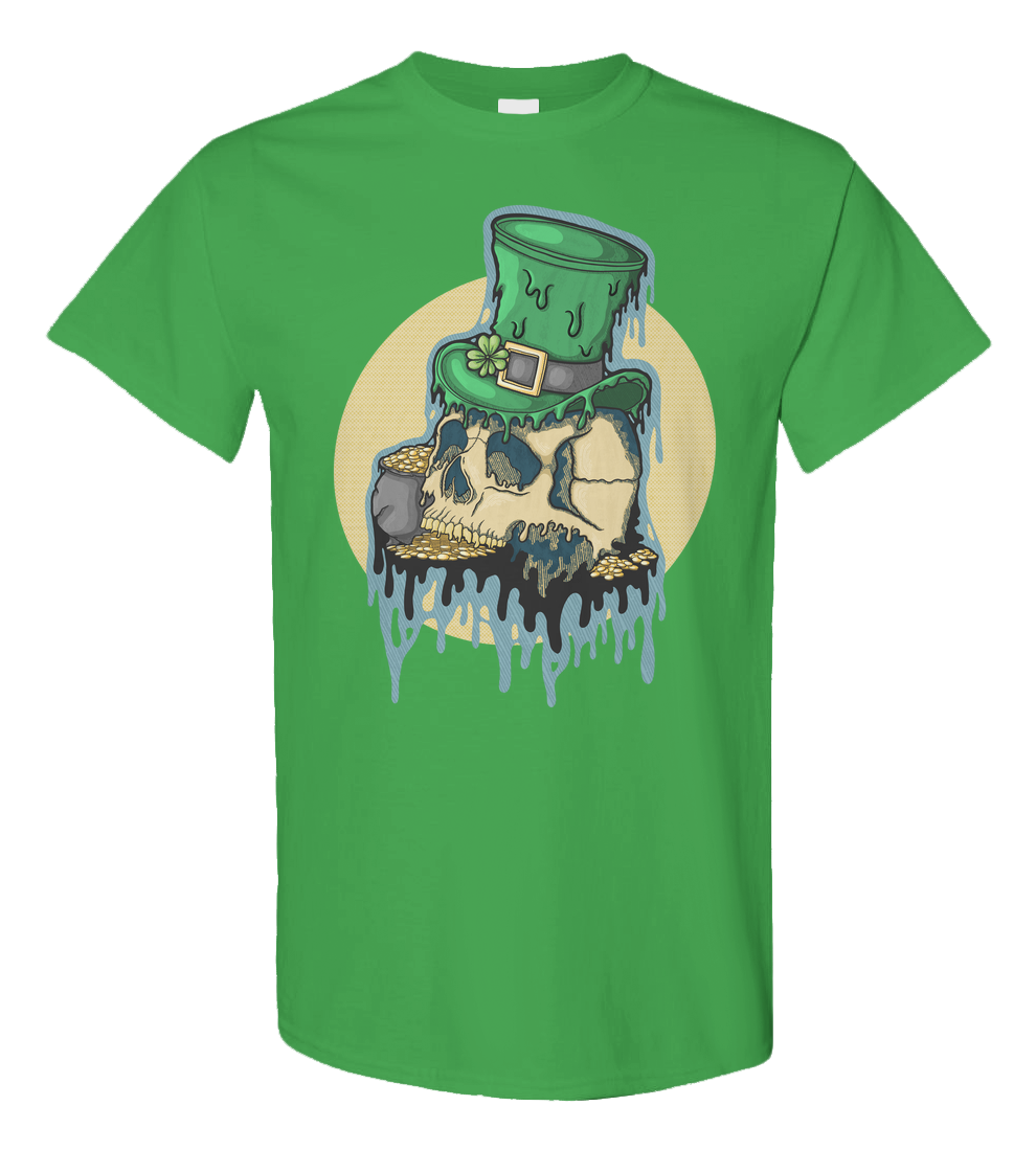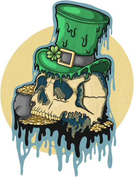 For this piece, I wanted to mix the fun of St. Patricks Day with my darker, drippy style. I hand-drew this skull wearing an oversized green hat, surrounded by a pot of gold spilling over. The design is a playful mix of festive and eerie, with dripping details tying it all together.