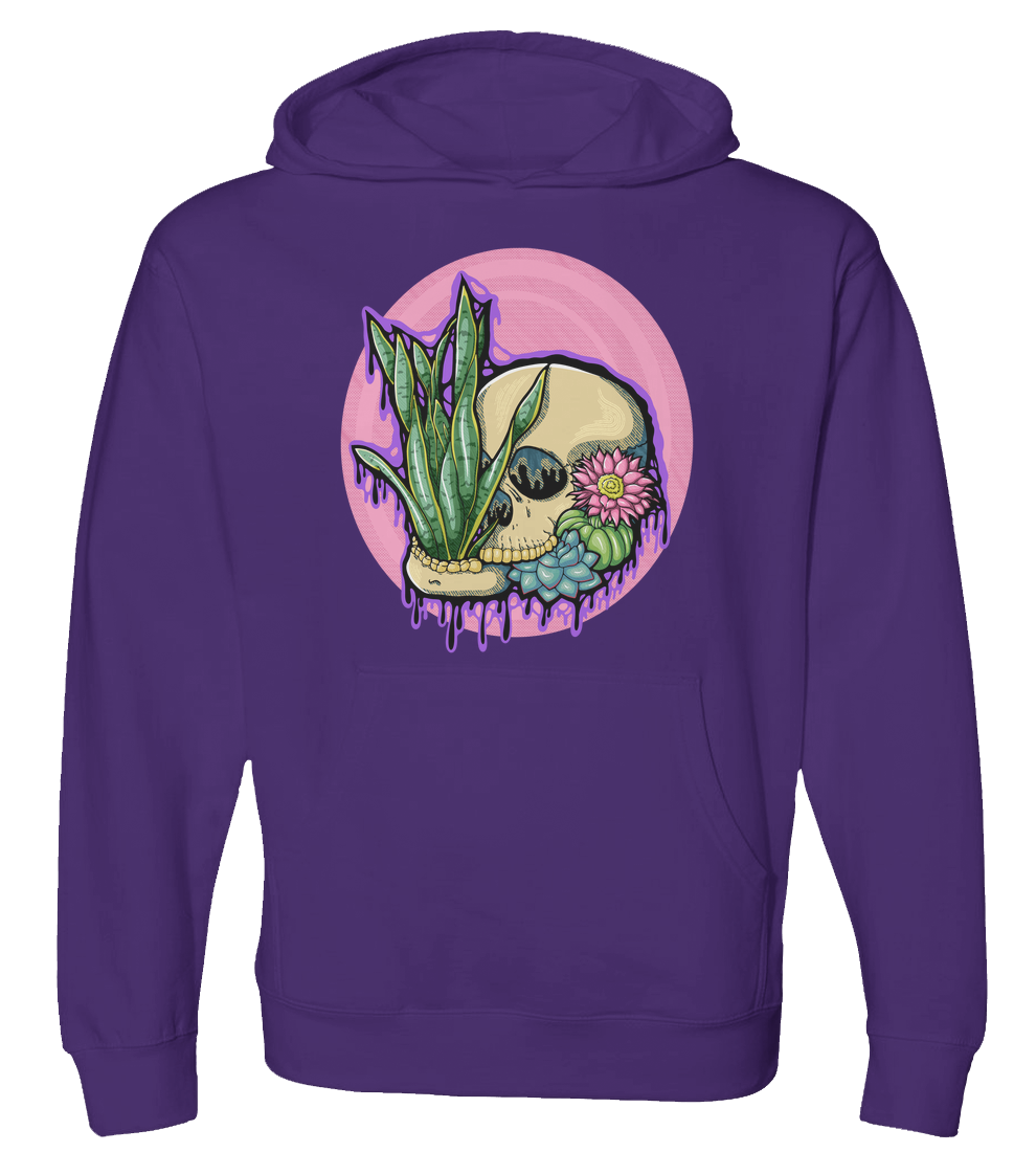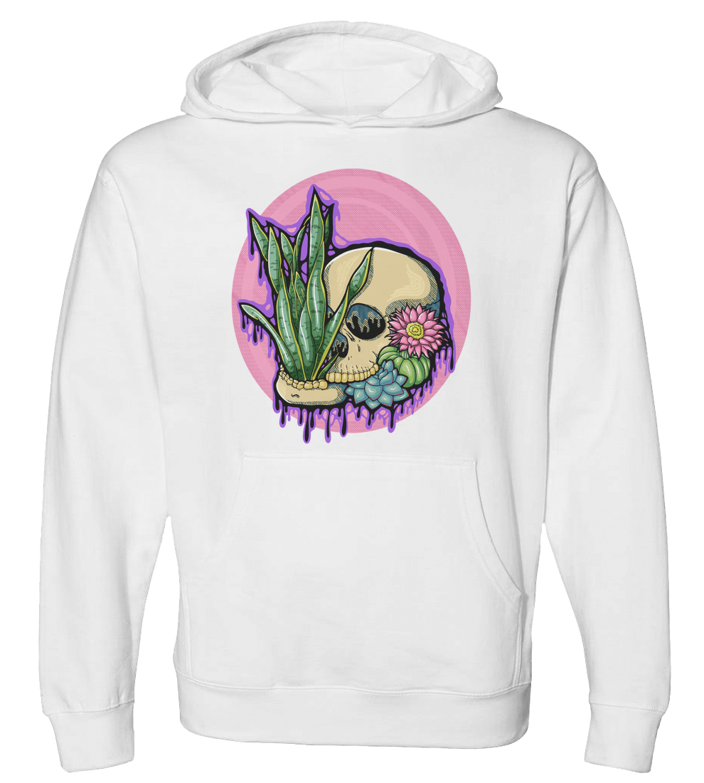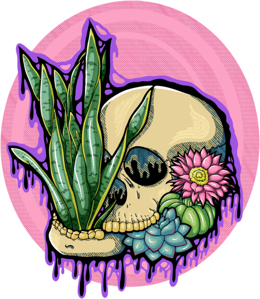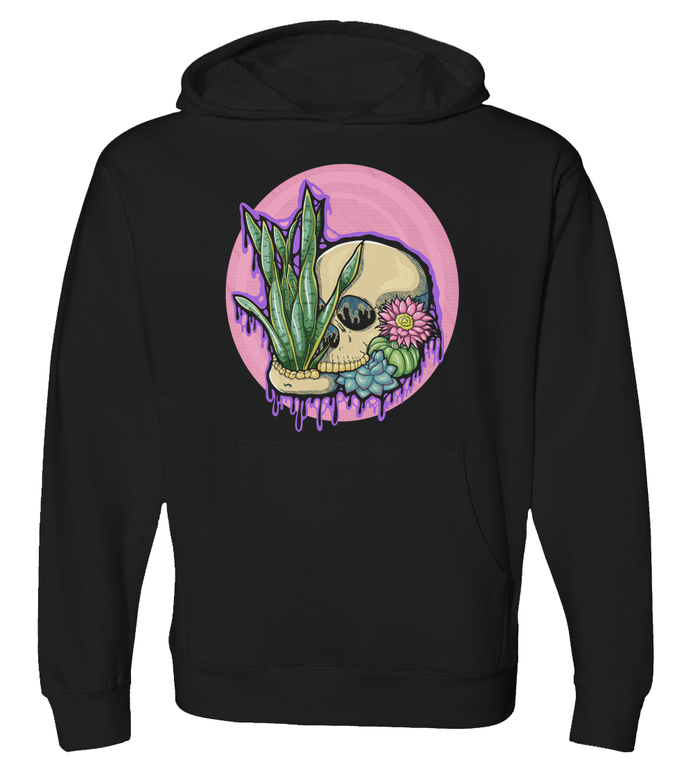 This design came from my love of pairing the sharpness of skulls with the softness of plants. I hand-drew this piece with succulents and a blooming flower bursting out of the skull, dripping in my signature style. Its meant to feel like a mix of dark and vibrant, life and decay, beauty and edge.