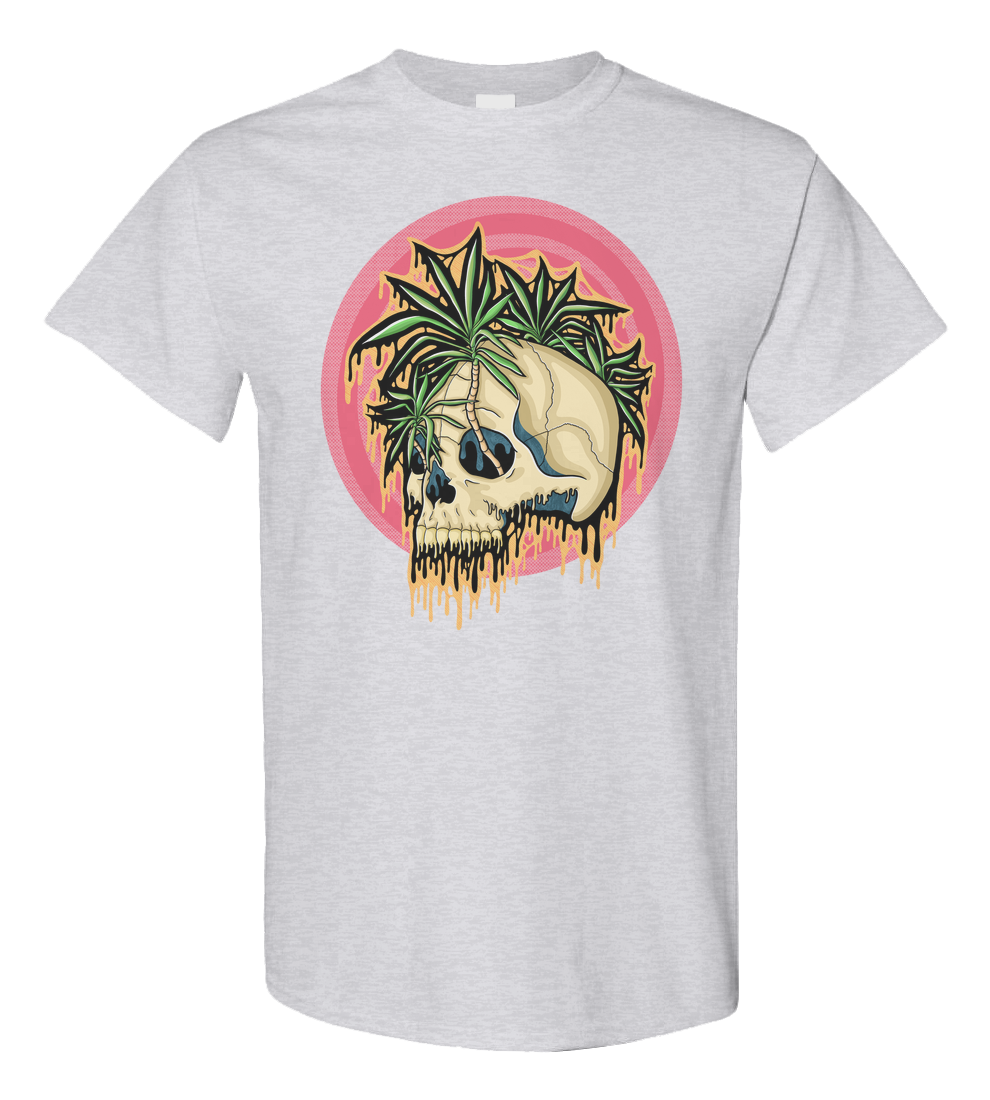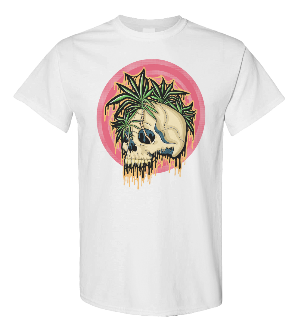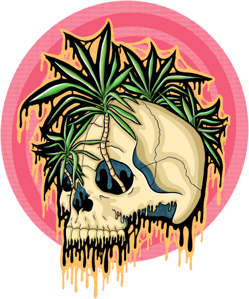 This piece takes the vibe of the tropics and twists it into something darker. I hand-drew this skull with palm-like leaves sprouting out, dripping with my signature style. I wanted it to feel like a mix of paradise and decay, bright greens and pinks clashing with bone and shadow.