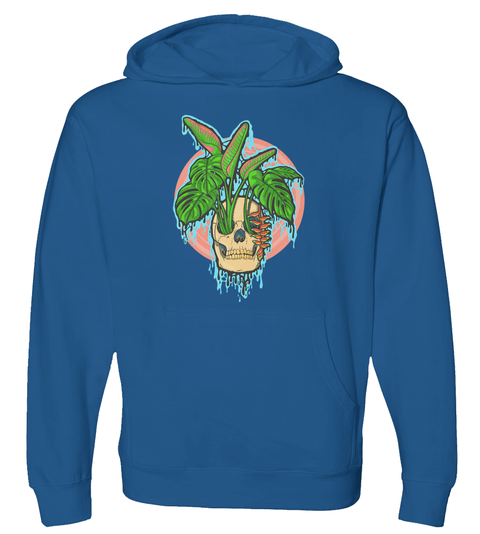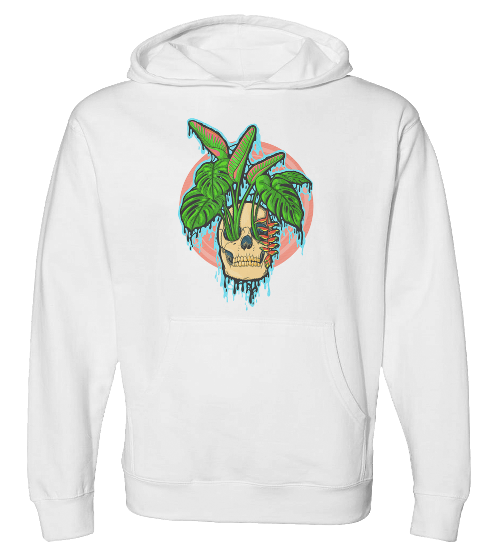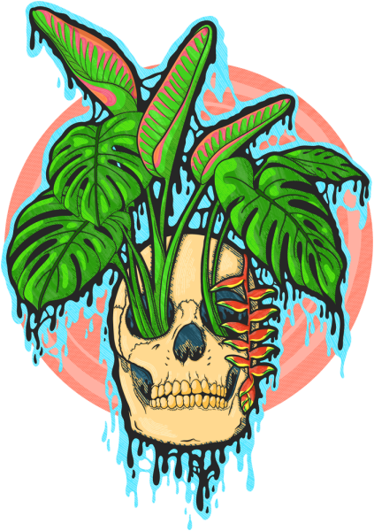 This one grew out of my love for plants and skulls, two things that seem so different, but come together in a strangely beautiful way. I hand-drew this design with bold tropical leaves bursting out of a skull, dripping with my signature style. Its a mix of life and decay, bright and eerie all at once.