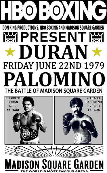 Roberto Duran vs. Carlos PalominoRoberto Duran 146 lbs beat Carlos Palomino 145 lbs by UD in round 10 of 10. Date: 1979-06-22 Location: Madison Square Garden, New York, New York, USA Referee: Arthur Mercante 99-90 Judge: Harold Lederman 99-90 Judge: Tony Castellano 99-91