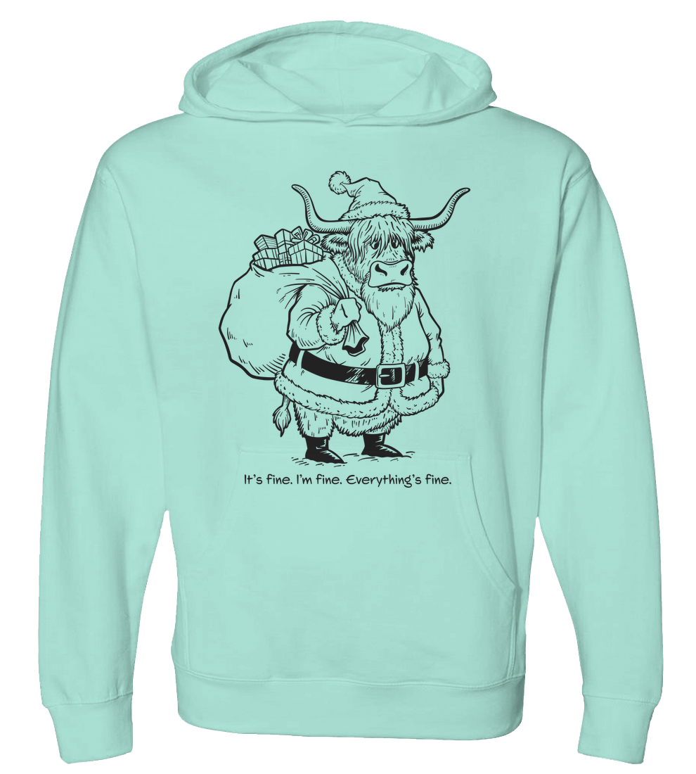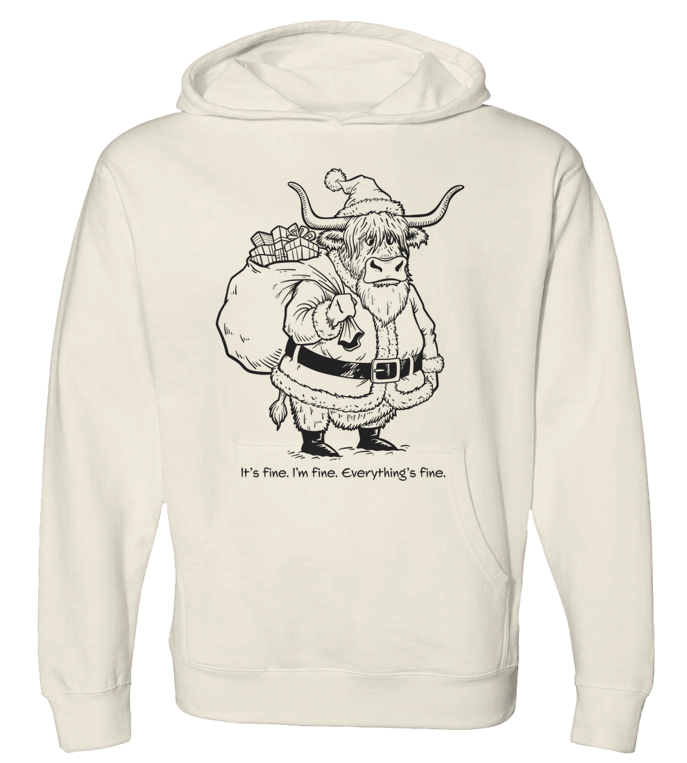 Bring some relatable humor to the holidays with this Funny Christmas design featuring a stressed-out Santa Highland Cow proclaiming that Everythings Fine. The quirky Santa Cow is ideal for anyone feeling that classic holiday burnout.