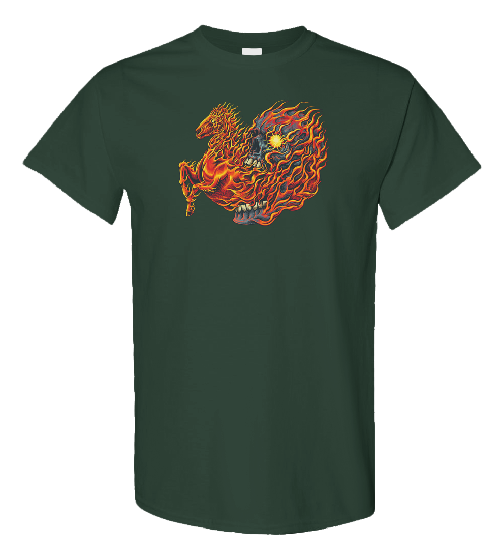Unleash the heat with a design that blurs the line between phantom and flame. This illustration features a spectral horse made entirely of roaring fire, charging forth as it morphs into a giant, burning skull. With intricate cross-hatching and a high-contrast palette of embers and ash, "Infernal Gallop" is a tribute to raw power, speed, and the supernatural. Perfect for those who ride with a dark heart.