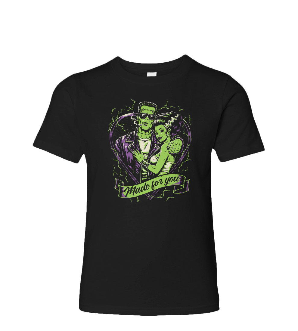 This awesome, cool, and funny t-shirt is perfect for those who love spooky books, classic movies, creepy creatures, scary artwork, horror, science fiction, Halloween, love, and Valentine's Day. It features a stylish rockstar couple of monsters, created by a mad doctor, with the quote "Made for you".