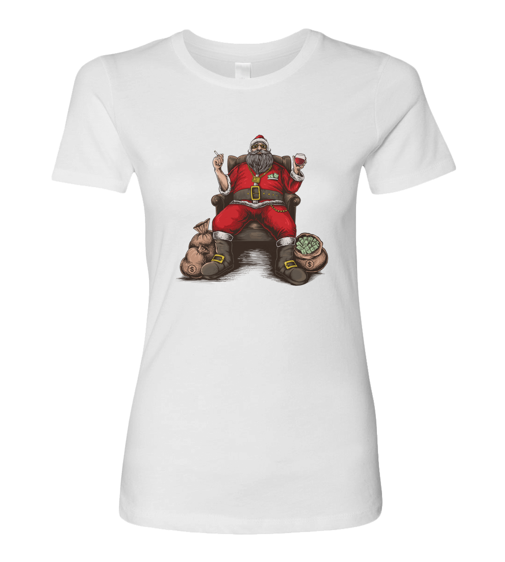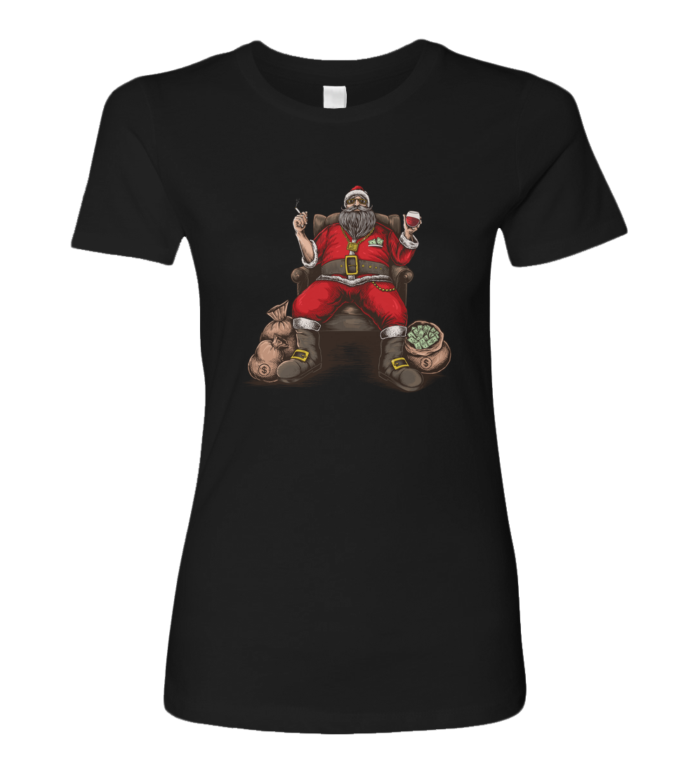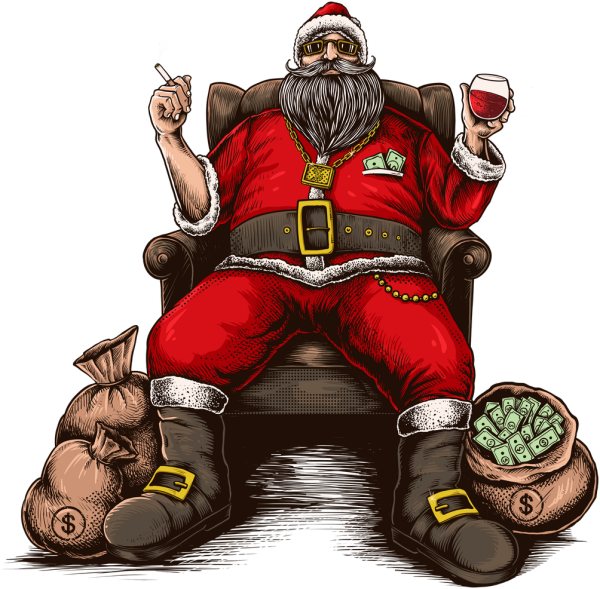 Santa Claus taking a well-deserved break. Featuring a vintage engraving style, this design shows the Boss of the North Pole chilling with his cash, wine, and shades. Being naughty pays off.