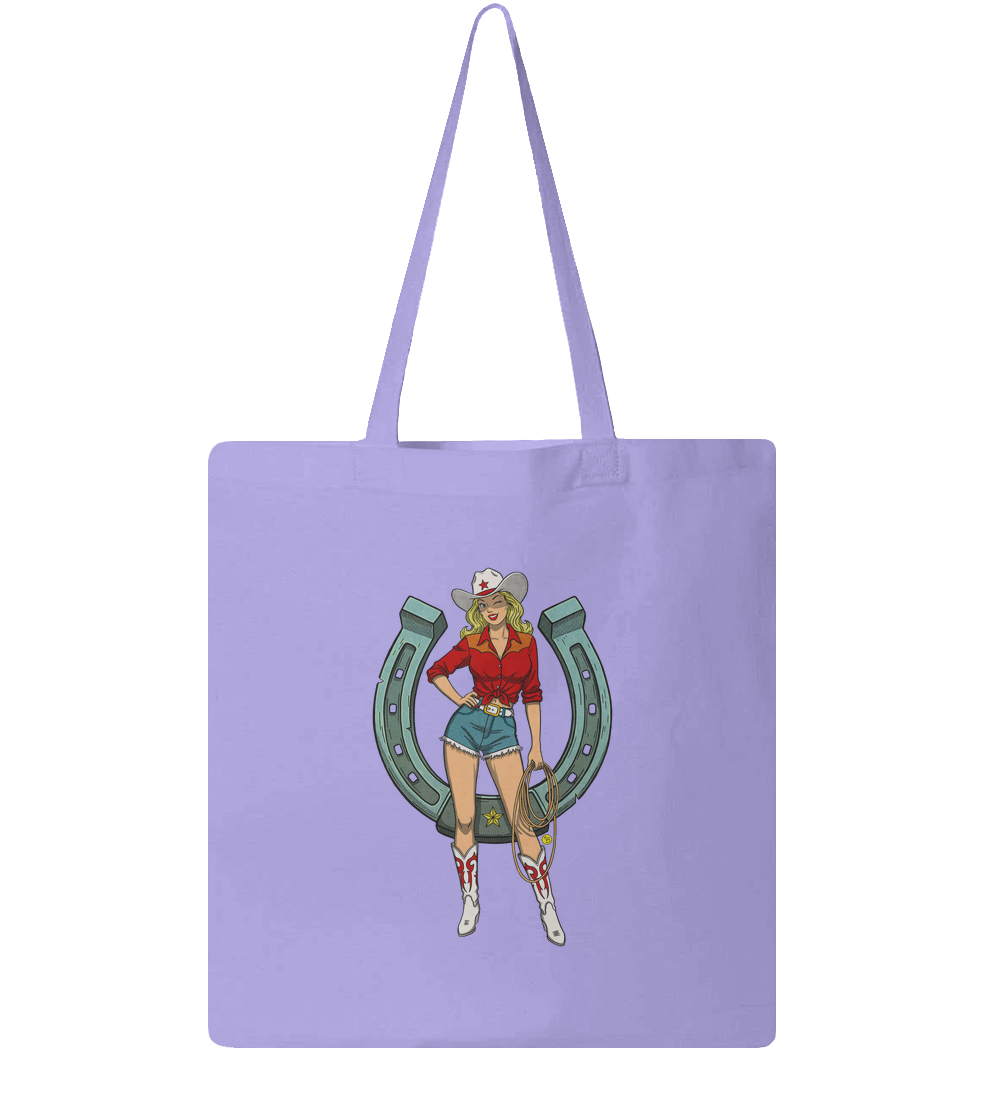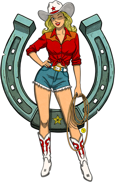 There's a reason the West was wild. This illustration features a winking cowgirl in classic denim framed by a weathered horseshoe for that extra bit of luck. Every line is infused with vintage grit, designed to look like it was ripped from a 1950s dime-store novel.