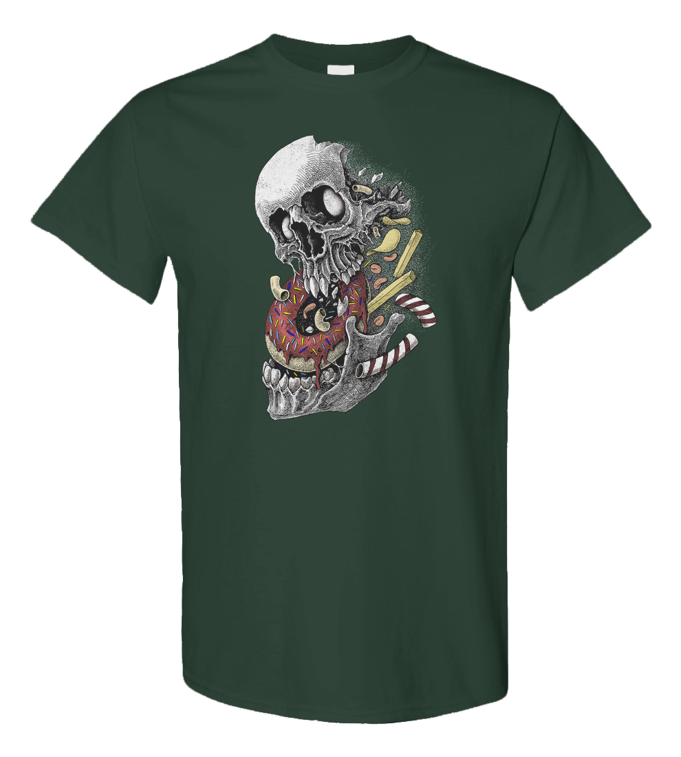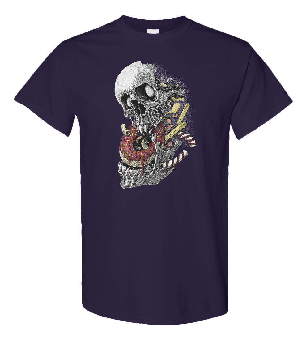 A surreal and darkly humorous illustration featuring a weathered skull literally bursting apart from an explosion of junk food. The skull is depicted mid-bite into a frosted sprinkle donut, while french fries, potato chips, macaroni, and candy wafers scatter into the void.