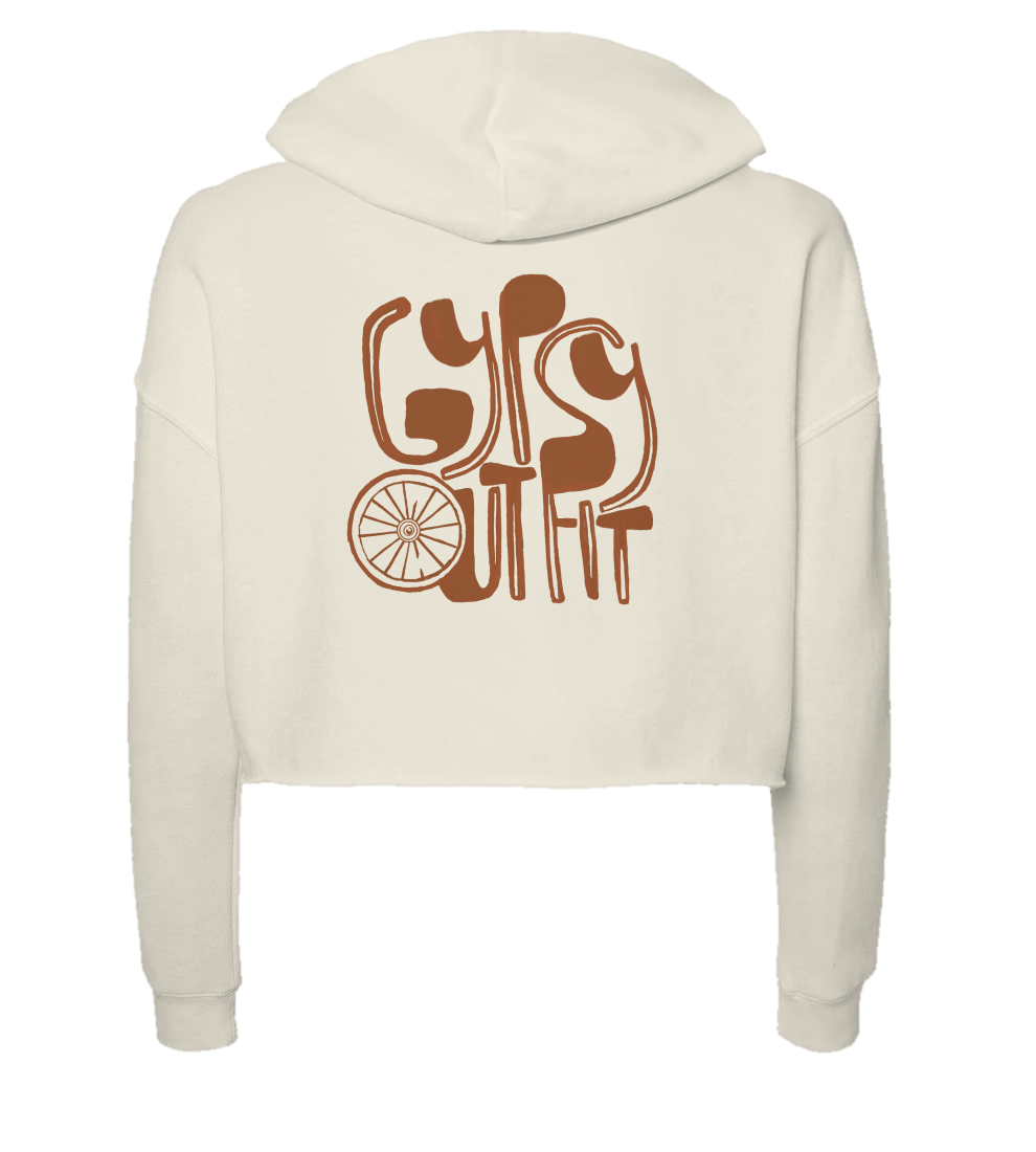 Bone-colored ladies crop hoodie with feather design on front, and updated logo on back
