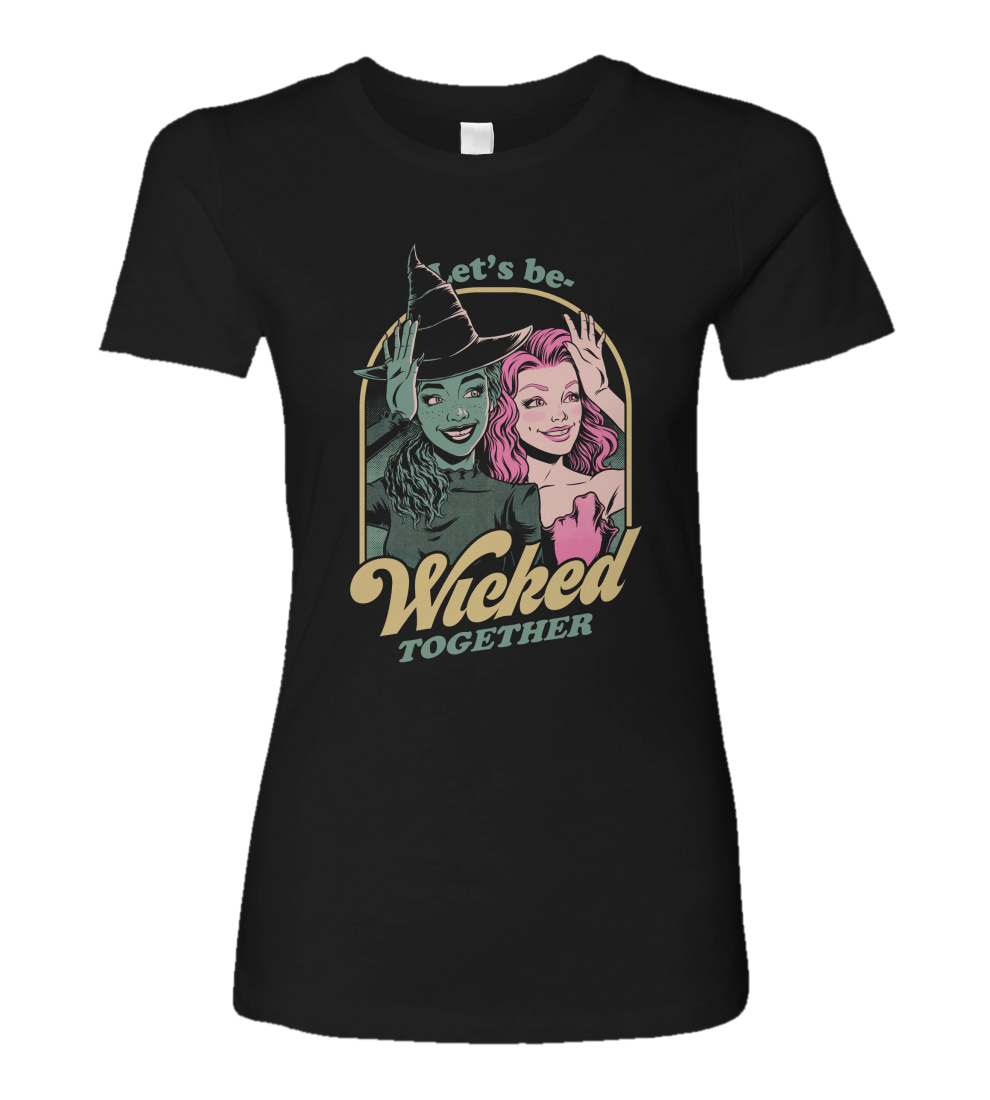This funny, cool, and awesome t-shirt is perfect for those who love classic vintage retro movies, theater, witches, fantasy, and musicals. Featuring a green wicked witch in a black dress and a blond witch in a pink dress.