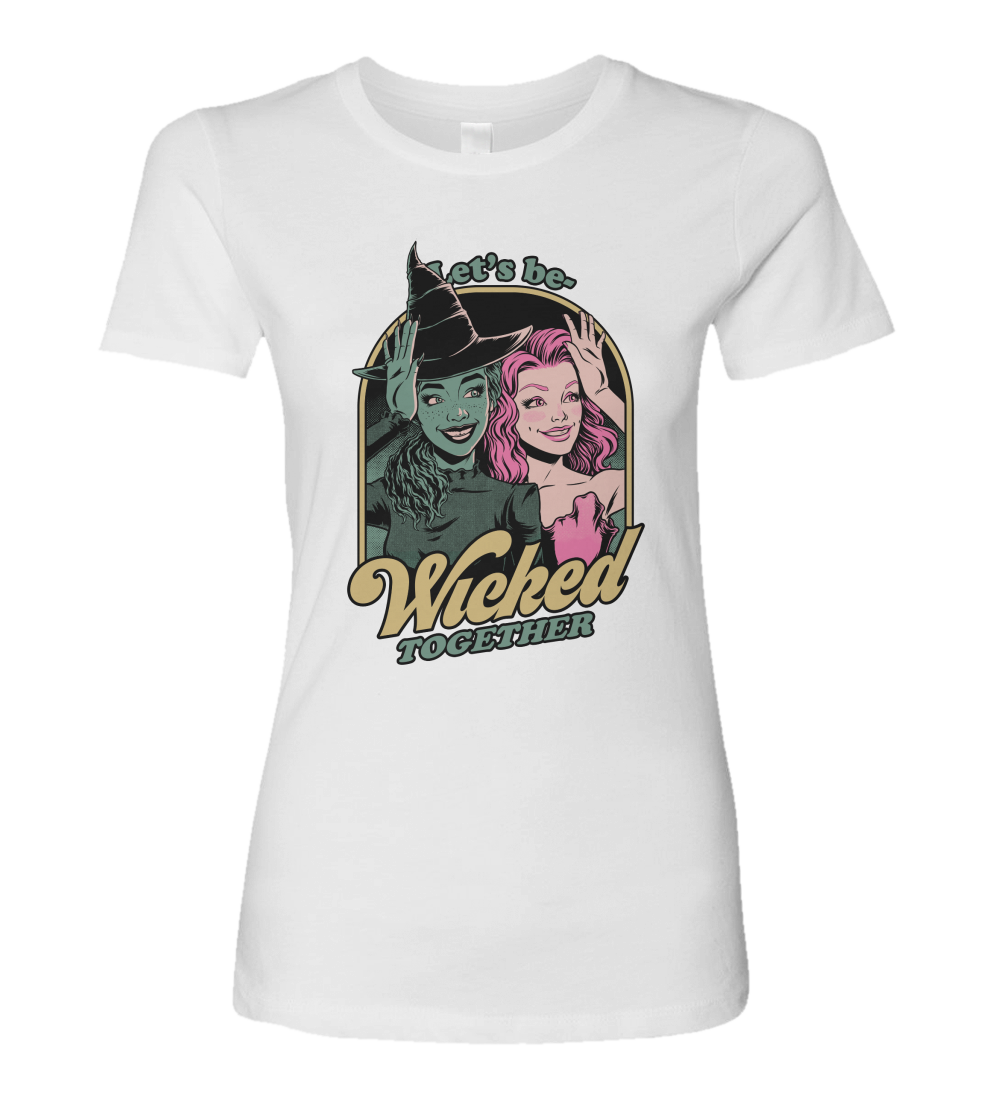 This funny, cool, and awesome t-shirt is perfect for those who love classic vintage retro movies, theater, witches, fantasy, and musicals. Featuring a green wicked witch in a black dress and a blond witch in a pink dress.