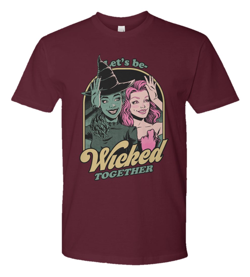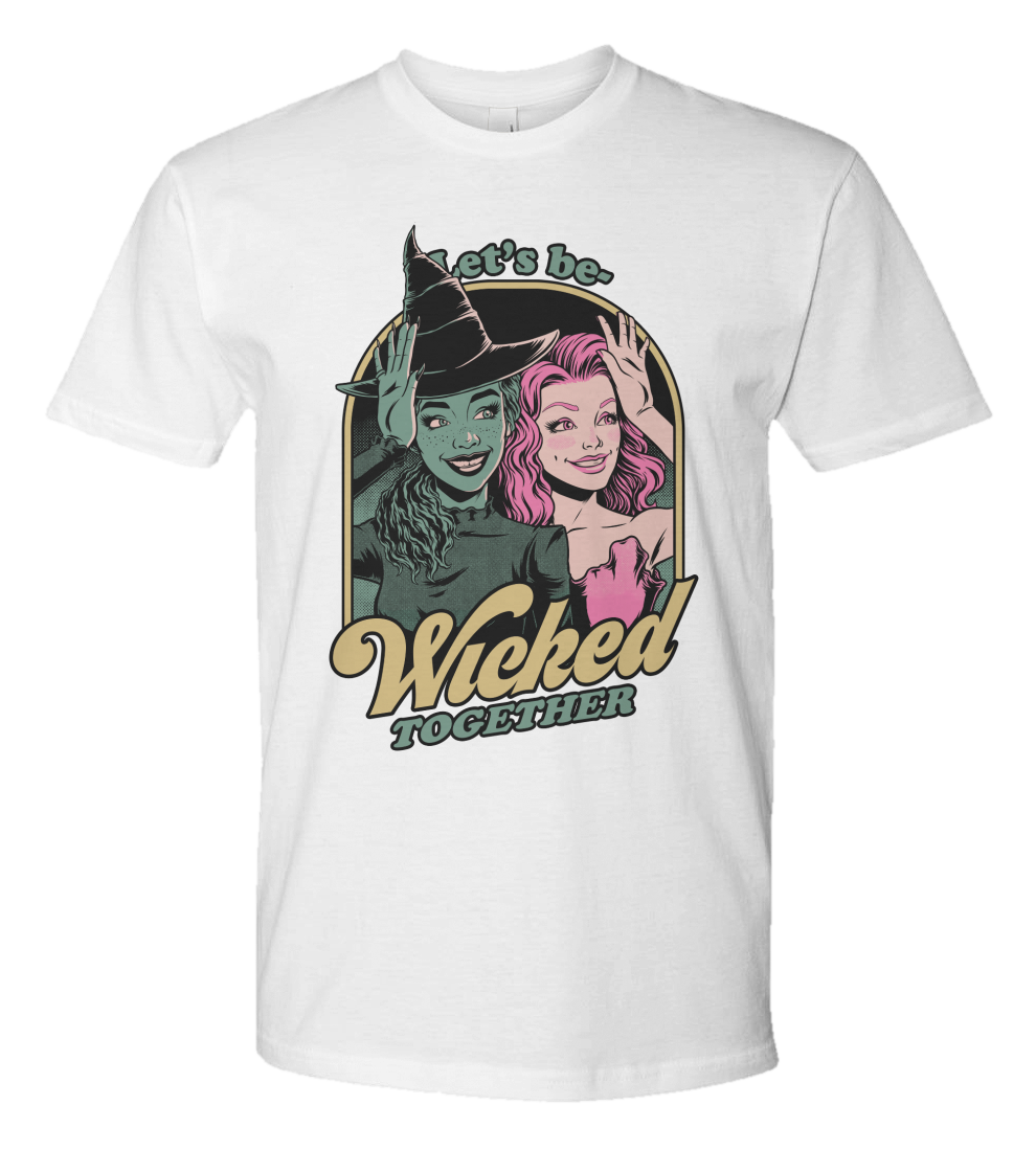 This funny, cool, and awesome t-shirt is perfect for those who love classic vintage retro movies, theater, witches, fantasy, and musicals. Featuring a green wicked witch in a black dress and a blond witch in a pink dress.