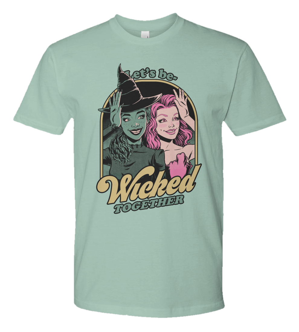 This funny, cool, and awesome t-shirt is perfect for those who love classic vintage retro movies, theater, witches, fantasy, and musicals. Featuring a green wicked witch in a black dress and a blond witch in a pink dress.