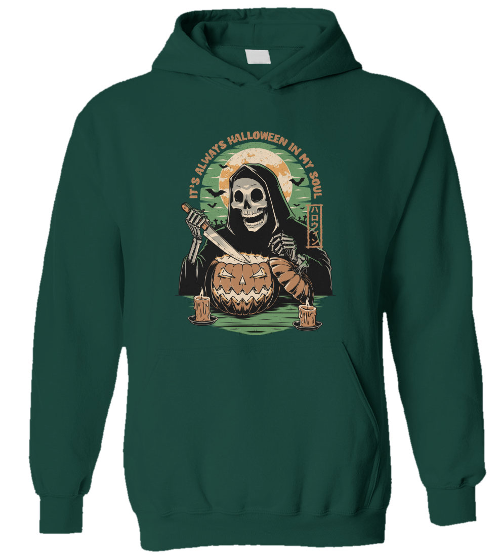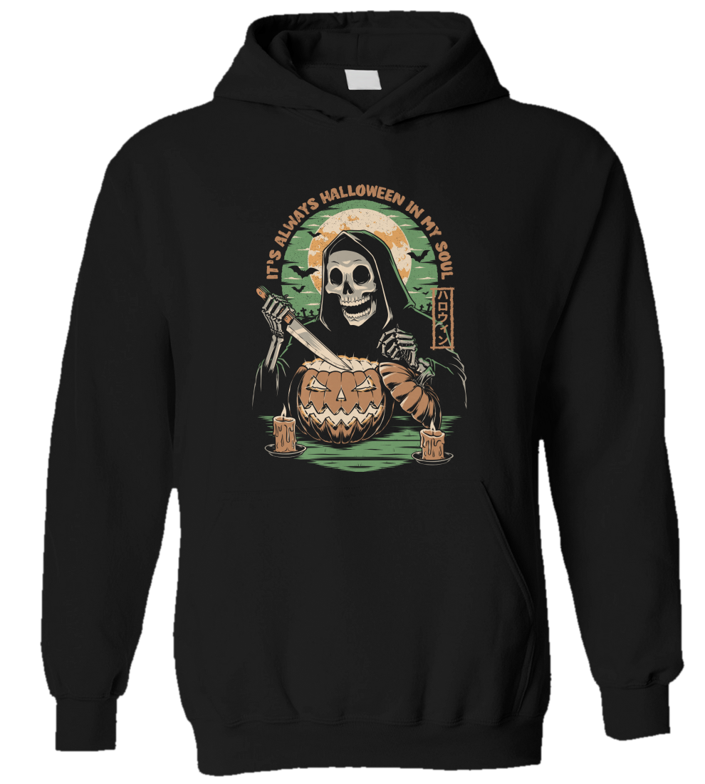 This cool and awesome t-shirt is perfect for those who love the spooky season, Halloween, creepy art, haunted places, skulls, and graveyards. Featuring a death-smiling skeleton sculpting an evil shining pumping with a graveyard in the background. With the quote "It's always Halloween in my soul".