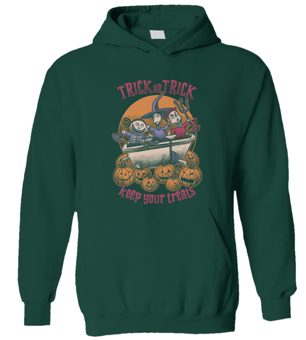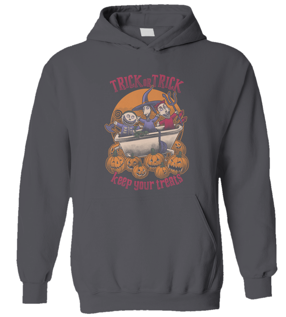 This cool and funny t-shirt is perfect for those who love classic animated movies, stop-motion, Boogie's Boys, and Halloween. Featuring the three Santa Claus kidnappers surrounded by pumpkins and the quote "Tricks or Tricks - Keep your Treats".