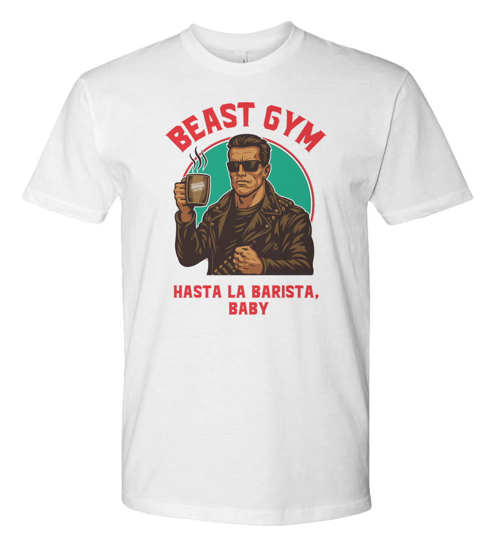 When the grind calls, you answer with style, strength, and a fresh brew in hand. The Beast Gym Hasta La Barista t-shirt brings classic action-icon energy into the world of caffeine and iron, perfect for anyone who loves lifting as much as their first cup of the day.